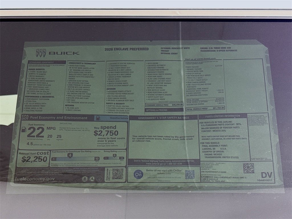 This 2026 Buick Enclave Preferred New Vehicle Purchase in iridescent white tricoat comes with the following features: FWD, 110-Volt Power Outlet, 12 Speakers, 2nd Row 1-Touch Flat Folding Seat, 3 Years SiriusXM, 3rd row seats: split-bench, 4-Wheel Disc Brakes, ABS brakes, Air Conditioning, Alloy wheels, AM/FM radio: SiriusXM with 360L, Apple CarPlay/Android Auto, Auto High-beam Headlights, Auto-dimming door mirrors, Auto-dimming Rear-View mirror, Automatic temperature control, Brake assist, Bumpers: body-color, Compass, Delay-off headlights, Driver 4-Way Power Lumbar Seat Adjuster, Driver 8-Way Power Seat Adjuster, Driver door bin, Driver vanity mirror, Dual front impact airbags, Dual front side impact airbags, Electronic Stability Control, Emergency communication system: OnStar and Buick connected services capable, Four wheel independent suspension, Front anti-roll bar, Front Bucket Seats, Front Center Armrest, Front dual zone A/C, Front Mounting License Plate Bracket Package, Front Passenger 4-Way Power Lumbar Seat Adjuster, Front Passenger 6-Way Power Seat Adjuster, Front reading lights, Fully automatic headlights, Head-Up Display, Heated door mirrors, Heated front seats, Heated steering wheel, Heated Wiper Park, Illuminated entry, Leather steering wheel, Leatherette Seat Trim, Low tire pressure warning, Memory Settings, Navigation System, Occupant sensing airbag, Outside temperature display, Overhead airbag, Overhead console, Panic alarm, Passenger door bin, Passenger vanity mirror, Power door mirrors, Power driver seat, Power Liftgate, Power Package, Power passenger seat, Power steering, Power windows, Preferred Equipment Group 1SD, Premium audio system: Buick Infotainment System, Radio data system, Radio: Infotainment Center, Rear air conditioning, Rear anti-roll bar, Rear reading lights, Rear side impact airbag, Rear window defroster, Rear window wiper, Remote keyless entry, Security system, Speed control, Speed-sensing steering, Spoiler, Steering wheel mounted audio controls, Tachometer, Telescoping steering wheel, Tilt steering wheel, Traction control, Trip computer, Turn signal indicator mirrors, Universal Home Remote, Variably intermittent wipers, Voltmeter, Wireless Apple CarPlay, Wireless Google Android Auto, FWD.