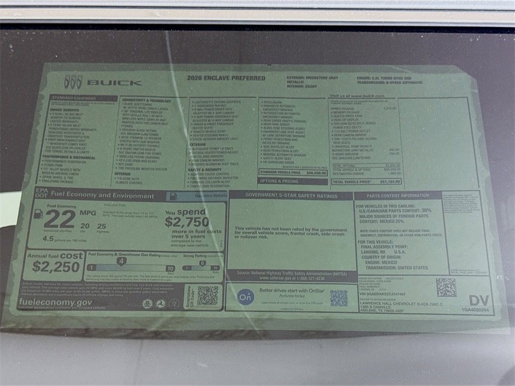 This 2026 Buick Enclave Preferred New Vehicle Purchase in moonstone gray metallic comes with the following features: FWD, 110-Volt Power Outlet, 12 Speakers, 2nd Row 1-Touch Flat Folding Seat, 3 Years SiriusXM, 3rd row seats: split-bench, 4-Wheel Disc Brakes, ABS brakes, Air Conditioning, Alloy wheels, AM/FM radio: SiriusXM with 360L, Apple CarPlay/Android Auto, Auto High-beam Headlights, Auto-dimming door mirrors, Auto-dimming Rear-View mirror, Automatic temperature control, Brake assist, Bumpers: body-color, Compass, Delay-off headlights, Driver 4-Way Power Lumbar Seat Adjuster, Driver 8-Way Power Seat Adjuster, Driver door bin, Driver vanity mirror, Dual front impact airbags, Dual front side impact airbags, Electronic Stability Control, Emergency communication system: OnStar and Buick connected services capable, Four wheel independent suspension, Front anti-roll bar, Front Bucket Seats, Front Center Armrest, Front dual zone A/C, Front Mounting License Plate Bracket Package, Front Passenger 4-Way Power Lumbar Seat Adjuster, Front Passenger 6-Way Power Seat Adjuster, Front reading lights, Fully automatic headlights, Head-Up Display, Heated door mirrors, Heated front seats, Heated steering wheel, Heated Wiper Park, Illuminated entry, Leather steering wheel, Leatherette Seat Trim, Low tire pressure warning, Memory Settings, Navigation System, Occupant sensing airbag, Outside temperature display, Overhead airbag, Overhead console, Panic alarm, Passenger door bin, Passenger vanity mirror, Power door mirrors, Power driver seat, Power Liftgate, Power Package, Power passenger seat, Power steering, Power windows, Preferred Equipment Group 1SD, Premium audio system: Buick Infotainment System, Radio data system, Radio: Infotainment Center, Rear air conditioning, Rear anti-roll bar, Rear reading lights, Rear side impact airbag, Rear window defroster, Rear window wiper, Remote keyless entry, Security system, Speed control, Speed-sensing steering, Spoiler, Steering wheel mounted audio controls, Tachometer, Telescoping steering wheel, Tilt steering wheel, Traction control, Trip computer, Turn signal indicator mirrors, Universal Home Remote, Variably intermittent wipers, Voltmeter, Wireless Apple CarPlay, Wireless Google Android Auto, FWD.