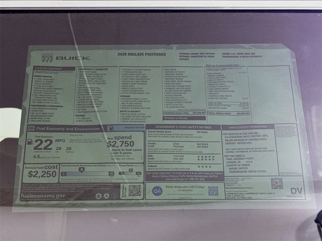 This 2026 Buick Enclave Preferred New Vehicle Purchase in cherry red tintcoat comes with the following features: FWD, 110-Volt Power Outlet, 12 Speakers, 2nd Row 1-Touch Flat Folding Seat, 3rd Row 60/40 Power Split-Folding Bench Seat, 3rd row seats: split-bench, 4-Wheel Disc Brakes, ABS brakes, Air Conditioning, Alloy wheels, AM/FM radio: SiriusXM with 360L, Apple CarPlay/Android Auto, Auto High-beam Headlights, Auto-dimming door mirrors, Auto-dimming Rear-View mirror, Automatic temperature control, Bose Premium 12-Speaker Audio System with Subwoofer, Brake assist, Bumpers: body-color, Compass, Delay-off headlights, Driver 4-Way Power Lumbar Seat Adjuster, Driver 8-Way Power Seat Adjuster, Driver door bin, Driver vanity mirror, Dual front impact airbags, Dual front side impact airbags, Electronic Stability Control, Emergency communication system: OnStar and Buick connected services capable, Four wheel independent suspension, Front anti-roll bar, Front Bucket Seats, Front Center Armrest, Front dual zone A/C, Front Mounting License Plate Bracket Package, Front Passenger 4-Way Power Lumbar Seat Adjuster, Front Passenger 6-Way Power Seat Adjuster, Front reading lights, Fully automatic headlights, Head-Up Display, Heated door mirrors, Heated Driver and Front Passenger Seats, Heated front seats, Heated steering wheel, Heated Wiper Park, Illuminated entry, Inside Rearview Auo-Dimming Rear Camera Mirror, Leather steering wheel, Leatherette Seat Trim, Low tire pressure warning, Memory Settings, Navigation System, Occupant sensing airbag, Outside temperature display, Overhead airbag, Overhead console, Panic alarm, Passenger door bin, Passenger vanity mirror, Power door mirrors, Power driver seat, Power Liftgate, Power Package, Power passenger seat, Power steering, Power windows, Preferred Equipment Group 1SD, Premium audio system: Buick Infotainment System, Radio data system, Radio: Infotainment Center, Rear air conditioning, Rear anti-roll bar, Rear reading lights, Rear side impact airbag, Rear window defroster, Rear window wiper, Remote keyless entry, Security system, SiriusXM with 360L Trial Subscription, Speed control, Speed-sensing steering, Spoiler, Steering wheel mounted audio controls, Tachometer, Telescoping steering wheel, Tilt steering wheel, Traction control, Trip computer, Turn signal indicator mirrors, Universal Home Remote, Variably intermittent wipers, Voltmeter, Wheels: 20 Alloy with Medium Android Finish, Wireless Apple CarPlay, Wireless Google Android Auto, FWD.
