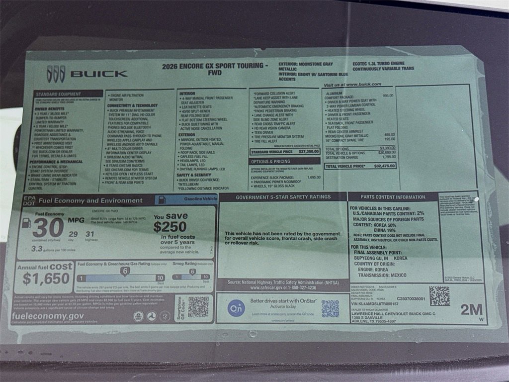 This 2026 Buick Encore GX Sport Touring New Vehicle Purchase in Moonstone Gray Metallic comes with the following features: 4-Way Manual Passenger Seat Adjuster, 4-Wheel Disc Brakes, 5.45 Final Drive Axle Ratio, 6 Speakers, 6-Way Manual Driver Seat Adjuster, 8-Way Power Driver Seat Adjuster, ABS brakes, Air Conditioning, Alloy wheels, AM/FM radio: SiriusXM, Auto High-beam Headlights, Automatic temperature control, Brake assist, Bumpers: body-color, Compass, Delay-off headlights, Driver door bin, Driver vanity mirror, Dual front impact airbags, Dual front side impact airbags, Electronic Stability Control, Emergency communication system: OnStar and Buick connected services capable, Enhanced Performance 6-Speaker System, Flat-Folding Front Passenger Seatback, Front anti-roll bar, Front Bucket Seats, Front Center Armrest, Front reading lights, Front wheel independent suspension, Fully automatic headlights, Heated door mirrors, Illuminated entry, Knee airbag, Leatherette Seat Trim, Low tire pressure warning, Occupant sensing airbag, Outside temperature display, Overhead airbag, Overhead console, Panic alarm, Passenger door bin, Passenger vanity mirror, Power door mirrors, Power steering, Power windows, Radio data system, Radio: AM/FM Audio System, Rear reading lights, Rear side impact airbag, Rear window defroster, Rear window wiper, Remote keyless entry, Security system, SiriusXM Trial Subscription, Speed control, Speed-sensing steering, Split folding rear seat, Spoiler, Sport steering wheel, Steering wheel mounted audio controls, Tachometer, Telescoping steering wheel, Tilt steering wheel, Traction control, Trip computer, Variably intermittent wipers, Wheels: 18 Gloss Black Aluminum, Wireless Apple CarPlay/Wireless Android Auto.