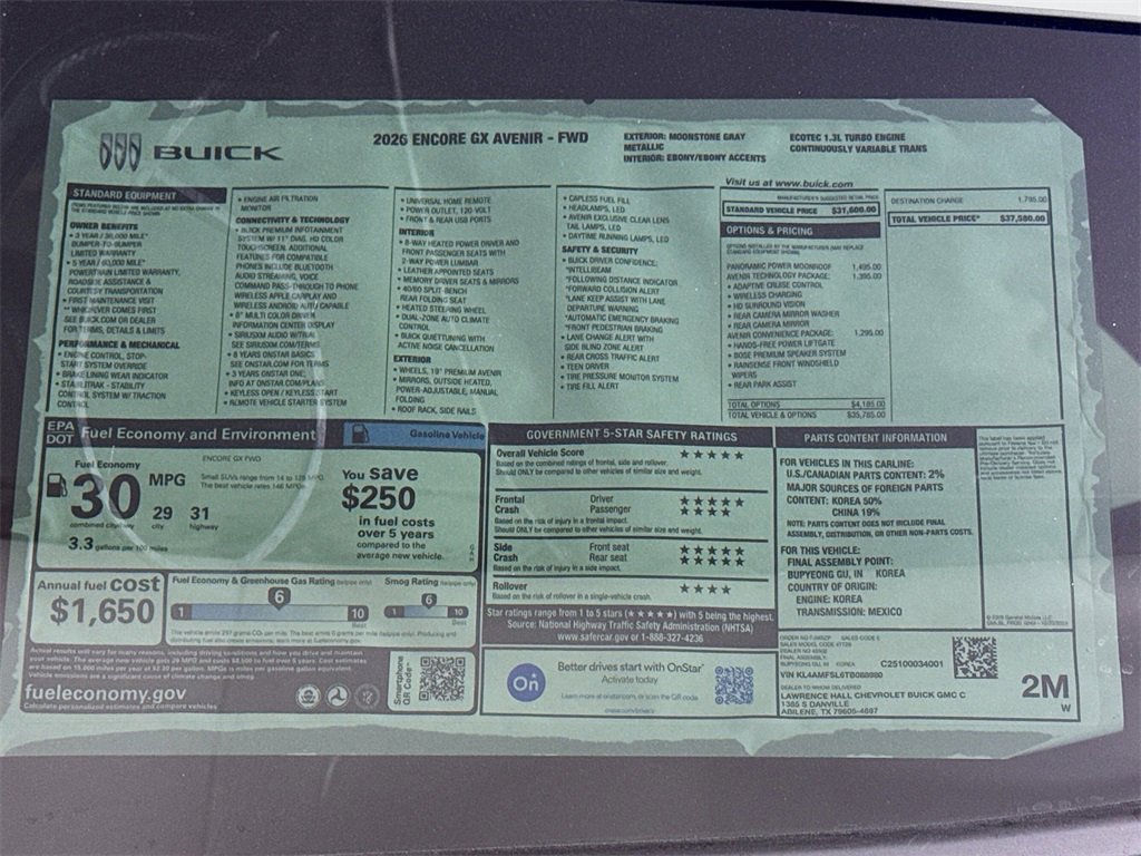This 2026 Buick Encore GX Avenir New Vehicle Purchase in Moonstone Gray Metallic comes with the following features: 2-Way Front Passenger Power Lumbar, 2-Way Power Driver Lumbar Control, 4-Wheel Disc Brakes, 5.45 Final Drive Axle Ratio, 6 Speakers, 6-Way Power Front Passenger Seat Adjuster, 8-Way Power Driver Seat Adjuster, ABS brakes, Adaptive Cruise Control, Air Conditioning, Alloy wheels, AM/FM radio: SiriusXM, Auto High-beam Headlights, Auto-dimming Rear-View mirror, Automatic temperature control, Avenir Convenience Package, Avenir Technology Package, Bose Premium 7-Speaker Audio System, Brake assist, Bumpers: body-color, Compass, Delay-off headlights, Driver door bin, Driver vanity mirror, Dual front impact airbags, Dual front side impact airbags, Electronic Stability Control, Emergency communication system: OnStar and Buick connected services capable, Enhanced Performance 6-Speaker System, Front anti-roll bar, Front Bucket Seats, Front Center Armrest, Front dual zone A/C, Front Intermittent Rainsense Wipers, Front License Plate Bracket, Front reading lights, Front wheel independent suspension, Fully automatic headlights, Garage door transmitter, Hands Free Power Liftgate, HD Surround Vision, Heated door mirrors, Heated Driver and Front Passenger Seats, Heated front seats, Heated steering wheel, Illuminated entry, Knee airbag, Low tire pressure warning, Memory seat, Occupant sensing airbag, Outside temperature display, Overhead airbag, Overhead console, Panic alarm, Passenger door bin, Passenger vanity mirror, Perforated Leather-Appointed Seat Trim, Power door mirrors, Power driver seat, Power Panoramic Tilt-Sliding Moonroof, Power passenger seat, Power steering, Power windows, Preferred Equipment Group 1SL, Radio data system, Radio: AM/FM Audio System, Rear Camera Mirror, Rear Camera Mirror Washer, Rear Park Assist, Rear reading lights, Rear seat center armrest, Rear side impact airbag, Rear window defroster, Rear window wiper, Remote keyless entry, Ride and Handling Suspension, Security system, SiriusXM Trial Subscription, Speed control, Speed-sensing steering, Split folding rear seat, Spoiler, Steering wheel mounted audio controls, Tachometer, Telescoping steering wheel, Tilt steering wheel, Traction control, Trip computer, Variably intermittent wipers, Wheels: 19 Avenir Premium Pearl Nickel Aluminum, Wireless Apple CarPlay/Wireless Android Auto, Wireless Charging.