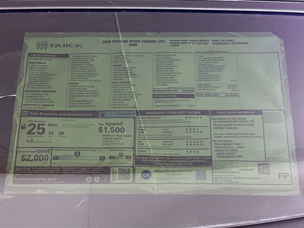 This 2026 Buick Envision Sport Touring New Vehicle Purchase in Ebony Twilight Metallic comes with the following features: 3-Channel Programmable Universal Home Remote, 3.47 Final Drive Axle Ratio, 30 Diagonal LCD Display, 4-Wheel Disc Brakes, 9 Speakers, ABS brakes, Air Conditioning, Air Quality Indicator Sensor, Alloy wheels, AM/FM radio: SiriusXM, Auto High-beam Headlights, Auto-dimming door mirrors, Auto-dimming Rear-View mirror, Automatic Air Recirculation, Automatic temperature control, Bose Premium 9-Speaker Audio System Feature, Brake assist, Bumpers: body-color, Comfort and Convenience Package, Compass, Delay-off headlights, Driver 4-Way Power Lumbar Seat Adjuster, Driver 8-Way Power Seat Adjuster, Driver door bin, Driver vanity mirror, Dual front impact airbags, Dual front side impact airbags, Dual-Zone Automatic Climate Control Air Conditioning, Electronic Stability Control, Emergency communication system: OnStar and Buick connected services capable, Exterior Parking Camera Rear, Four wheel independent suspension, Front anti-roll bar, Front Bucket Seats, Front Center Armrest, Front Passenger 6-Way Manual Seat Adjuster, Front reading lights, Fully automatic headlights, Hands-Free Power Programmable Liftgate, Heads-Up Display, Heated door mirrors, Heated Driver and Front Passenger Seats, Heated Steering Wheel, Illuminated entry, Knee airbag, Leather steering wheel, Low tire pressure warning, Memory seat, Navigation System, Occupant sensing airbag, Outside temperature display, Overhead airbag, Overhead console, Panic alarm, Passenger door bin, Passenger vanity mirror, Perforated Leather-Appointed Seat Trim, Power door mirrors, Power driver seat, Power Liftgate, Power steering, Power windows, Preferred Equipment Group 1SL, Premium audio system: Buick Infotainment System, Radio data system, Radio: Infotainment Center, Rear anti-roll bar, Rear reading lights, Rear seat center armrest, Rear window defroster, Rear window wiper, Remote keyless entry, Security system, SiriusXM Trial Subscription, Speed control, Split folding rear seat, Spoiler, Sport steering wheel, Steering wheel mounted audio controls, Telescoping steering wheel, Tilt steering wheel, Traction control, Trip computer, Variably intermittent wipers, Wheels: 20 Carbon Flash Metallic Alloy, Wireless Apple CarPlay/Wireless Android Auto.