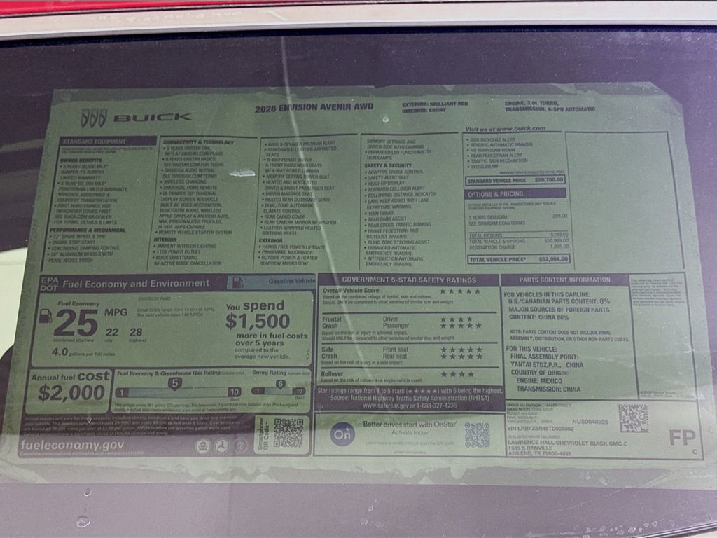 This 2026 Buick Envision Avenir New Vehicle Purchase in Brilliant Red comes with the following features: 3.47 Final Drive Axle Ratio, 30 Diagonal LCD Display, 4-Wheel Disc Brakes, 9 Speakers, ABS brakes, Adaptive suspension, Air Conditioning, Alloy wheels, AM/FM radio: SiriusXM, Auto High-beam Headlights, Auto-dimming door mirrors, Auto-dimming Rear-View mirror, Automatic temperature control, Bose Premium 9-Speaker Audio System Feature, Brake assist, Bumpers: body-color, Compass, Delay-off headlights, Driver 4-Way Power Lumbar Seat Adjuster, Driver 8-Way Power Seat Adjuster, Driver door bin, Driver Seat Massage Control, Driver vanity mirror, Dual front impact airbags, Dual front side impact airbags, Electronic Stability Control, Emergency communication system: OnStar and Buick connected services capable, Exterior Parking Camera Rear, Four wheel independent suspension, Front anti-roll bar, Front Bucket Seats, Front Center Armrest, Front dual zone A/C, Front Passenger 4-Way Power Lumbar Seat Adjuster, Front Passenger 8-Way Power Seat Adjuster, Front reading lights, Fully automatic headlights, Garage door transmitter, Heads-Up Display, Heated door mirrors, Heated Driver and Front Passenger Seats, Heated front seats, Heated rear seats, Heated steering wheel, Illuminated entry, Knee airbag, Leather steering wheel, Low tire pressure warning, Memory seat, Navigation System, Occupant sensing airbag, Outside temperature display, Overhead airbag, Overhead console, Panic alarm, Passenger door bin, Passenger vanity mirror, Power door mirrors, Power driver seat, Power Liftgate, Power moonroof, Power passenger seat, Power steering, Power windows, Preferred Equipment Group 1SU, Premium audio system: Buick Infotainment System, Quilted and Perforated Leather-Appointed Seat Trim, Radio data system, Radio: 3 Years SiriusXM, Radio: Infotainment Center, Rear anti-roll bar, Rear reading lights, Rear seat center armrest, Rear window defroster, Rear window wiper, Remote keyless entry, Security system, SiriusXM Trial Subscription, Speed control, Split folding rear seat, Spoiler, Steering wheel mounted audio controls, Telescoping steering wheel, Tilt steering wheel, Traction control, Trip computer, Variably intermittent wipers, Ventilated Driver and Front Passenger Seats, Ventilated front seats, Wheels: 20 Alloy with Pearl Nickel Finish, Wireless Apple CarPlay/Wireless Android Auto.