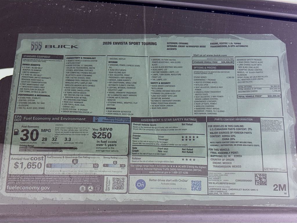 Recent Arrival! This 2026 Buick Envista Sport Touring New Vehicle Purchase in Ceramic comes with the following features: 2 USB Ports (1 Type-A, 1 Type-C), 3.50 Final Drive Axle Ratio, 4-Way Manual Front Passenger Seat Adjuster, 4-Wheel Disc Brakes, 6 Speakers, 6-Way Manual Driver Seat Adjuster, 8-Way Power Driver Seat Adjuster, ABS brakes, Air Conditioning, Alloy wheels, AM/FM radio: SiriusXM, Auto High-beam Headlights, Automatic temperature control, Brake assist, Bumpers: body-color, Compass, Delay-off headlights, Driver door bin, Driver vanity mirror, Dual front impact airbags, Dual front side impact airbags, Electronic Stability Control, Emergency communication system: OnStar, Exterior Parking Camera Rear, Front anti-roll bar, Front Bucket Seats, Front Center Armrest, Front reading lights, Front wheel independent suspension, Fully automatic headlights, Heated door mirrors, Illuminated entry, Leatherette Seat Trim, Low tire pressure warning, Occupant sensing airbag, Outside temperature display, Overhead airbag, Overhead console, Panic alarm, Passenger door bin, Passenger vanity mirror, Power door mirrors, Power steering, Power windows, Premium 6-Speaker Audio System Feature, Radio data system, Radio: AM/FM Stereo Audio System, Rear Parking Sensors, Rear window defroster, Remote keyless entry, Security system, SiriusXM Trial Subscription, Speed control, Split folding rear seat, Steering wheel mounted audio controls, Tachometer, Telescoping steering wheel, Tilt steering wheel, Traction control, Trip computer, Turn signal indicator mirrors, Variably intermittent wipers, Wheels: 18 Black Painted Aluminum, Wireless Apple CarPlay/Wireless Android Auto.