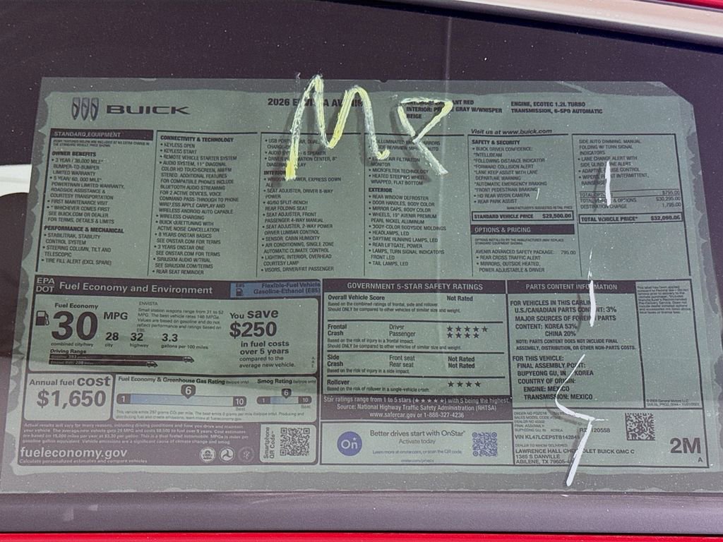 This 2026 Buick Envista Avenir New Vehicle Purchase in Brilliant Red comes with the following features: 2 USB Ports (1 Type-A, 1 Type-C), 2-Way Power Driver Lumbar Control, 3.50 Final Drive Axle Ratio, 4-Way Manual Front Passenger Seat Adjuster, 4-Wheel Disc Brakes, 6 Speakers, 8-Way Power Driver Seat Adjuster, ABS brakes, Adaptive Cruise Control, Air Conditioning, Alloy wheels, AM/FM radio: SiriusXM, Auto High-beam Headlights, Auto-dimming Rear-View mirror, Automatic temperature control, Avenir Advanced Safety Package, Brake assist, Bumpers: body-color, Compass, Delay-off headlights, Driver door bin, Driver vanity mirror, Dual front impact airbags, Dual front side impact airbags, Electronic Stability Control, Emergency communication system: OnStar, Exterior Parking Camera Rear, Front anti-roll bar, Front Bucket Seats, Front Center Armrest, Front Intermittent Rainsense Wipers, Front License Plate Bracket, Front reading lights, Front wheel independent suspension, Fully automatic headlights, Heated door mirrors, Heated Driver and Front Passenger Seats, Heated front seats, Heated steering wheel, Illuminated entry, Lane Change Alert with Side Blind Zone Alert, Low tire pressure warning, Occupant sensing airbag, Outside temperature display, Overhead airbag, Overhead console, Panic alarm, Passenger door bin, Passenger vanity mirror, Perforated Leather-Appointed Seat Trim, Power door mirrors, Power driver seat, Power Liftgate, Power steering, Power windows, Power-Adjustable Outside Heated Mirrors, Preferred Equipment Group G04, Premium 6-Speaker Audio System Feature, Radio data system, Radio: AM/FM Stereo Audio System, Rear Cross Traffic Alert, Rear Parking Sensors, Rear seat center armrest, Rear window defroster, Remote keyless entry, Security system, SiriusXM Trial Subscription, Speed control, Split folding rear seat, Steering wheel mounted audio controls, Tachometer, Telescoping steering wheel, Tilt steering wheel, Traction control, Trip computer, Turn signal indicator mirrors, Variably intermittent wipers, Wheels: 19 Avenir Premium Pearl Nickel Aluminum, Wireless Apple CarPlay/Wireless Android Auto.
