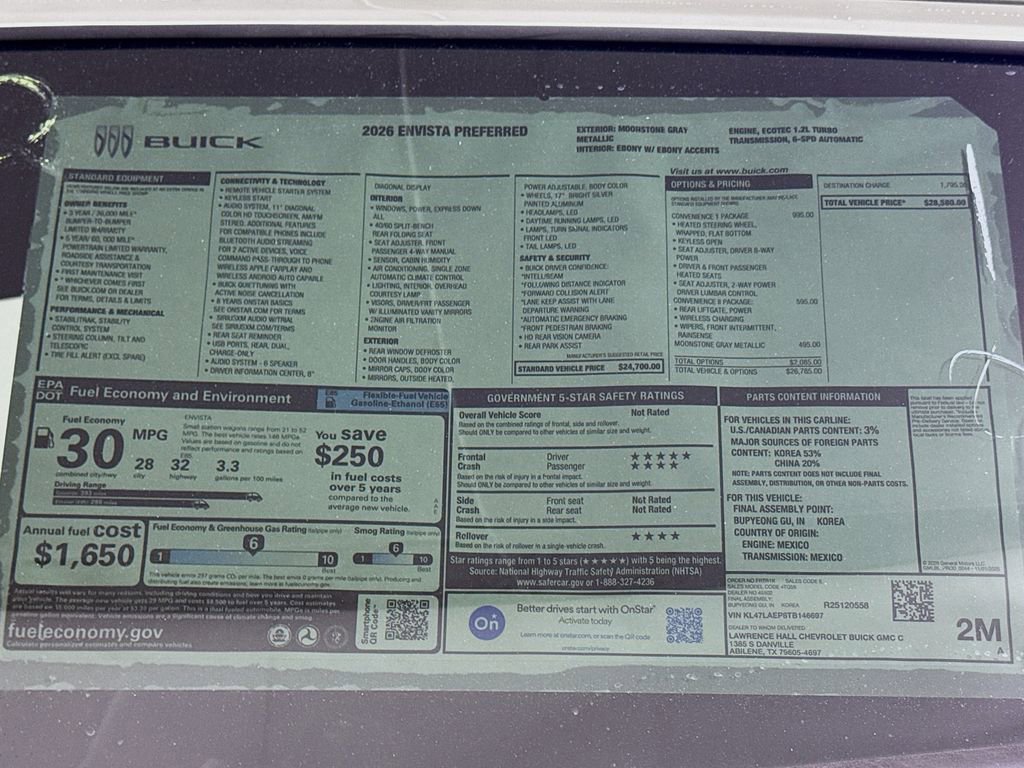 This 2026 Buick Envista Preferred New Vehicle Purchase in Moonstone Gray Metallic comes with the following features: 2 USB Ports (1 Type-A, 1 Type-C), 2-Way Power Driver Lumbar Control, 3.50 Final Drive Axle Ratio, 4-Way Manual Front Passenger Seat Adjuster, 4-Wheel Disc Brakes, 6 Speakers, 6-Way Manual Driver Seat Adjuster, 8-Way Power Driver Seat Adjuster, ABS brakes, Air Conditioning, Alloy wheels, AM/FM radio: SiriusXM, Auto High-beam Headlights, Automatic temperature control, Brake assist, Bumpers: body-color, Cloth with Leatherette Seat Trim, Compass, Convenience I Package, Convenience II Package, Delay-off headlights, Driver door bin, Driver vanity mirror, Dual front impact airbags, Dual front side impact airbags, Electronic Stability Control, Emergency communication system: OnStar, Exterior Parking Camera Rear, Flat-Bottom Wrapped Steering Wheel, Front anti-roll bar, Front Bucket Seats, Front Center Armrest, Front Doors Keyless Open, Front Intermittent Rainsense Wipers, Front License Plate Bracket, Front reading lights, Front wheel independent suspension, Fully automatic headlights, Heated door mirrors, Heated Driver and Front Passenger Seats, Heated Steering Wheel, Illuminated entry, Low tire pressure warning, Occupant sensing airbag, Outside temperature display, Overhead airbag, Overhead console, Panic alarm, Passenger door bin, Passenger vanity mirror, Power door mirrors, Power Liftgate, Power steering, Power windows, Preferred Equipment Group G02, Premium 6-Speaker Audio System Feature, Radio data system, Radio: AM/FM Stereo Audio System, Rear Parking Sensors, Rear window defroster, Remote keyless entry, Security system, SiriusXM Trial Subscription, Speed control, Split folding rear seat, Steering wheel mounted audio controls, Tachometer, Telescoping steering wheel, Tilt steering wheel, Traction control, Trip computer, Turn signal indicator mirrors, Variably intermittent wipers, Wheels: 17 Bright Silver Painted Aluminum, Wireless Apple CarPlay/Wireless Android Auto, Wireless Charging.