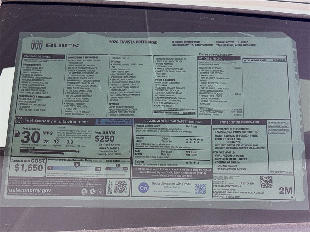 This 2026 Buick Envista Preferred New Vehicle Purchase in Summit White comes with the following features: 2 USB Ports (1 Type-A, 1 Type-C), 2-Way Power Driver Lumbar Control, 3.50 Final Drive Axle Ratio, 4-Way Manual Front Passenger Seat Adjuster, 4-Wheel Disc Brakes, 6 Speakers, 6-Way Manual Driver Seat Adjuster, 8-Way Power Driver Seat Adjuster, ABS brakes, Air Conditioning, Alloy wheels, AM/FM radio: SiriusXM, Auto High-beam Headlights, Automatic temperature control, Brake assist, Bumpers: body-color, Cloth with Leatherette Seat Trim, Compass, Convenience I Package, Convenience II Package, Delay-off headlights, Driver door bin, Driver vanity mirror, Dual front impact airbags, Dual front side impact airbags, Electronic Stability Control, Emergency communication system: OnStar, Exterior Parking Camera Rear, Flat-Bottom Wrapped Steering Wheel, Front anti-roll bar, Front Bucket Seats, Front Center Armrest, Front Doors Keyless Open, Front Intermittent Rainsense Wipers, Front License Plate Bracket, Front reading lights, Front wheel independent suspension, Fully automatic headlights, Heated door mirrors, Heated Driver and Front Passenger Seats, Heated Steering Wheel, Illuminated entry, Low tire pressure warning, Occupant sensing airbag, Outside temperature display, Overhead airbag, Overhead console, Panic alarm, Passenger door bin, Passenger vanity mirror, Power door mirrors, Power Liftgate, Power steering, Power windows, Preferred Equipment Group G02, Premium 6-Speaker Audio System Feature, Radio data system, Radio: AM/FM Stereo Audio System, Rear Parking Sensors, Rear window defroster, Remote keyless entry, Security system, SiriusXM Trial Subscription, Speed control, Split folding rear seat, Steering wheel mounted audio controls, Tachometer, Telescoping steering wheel, Tilt steering wheel, Traction control, Trip computer, Turn signal indicator mirrors, Variably intermittent wipers, Wheels: 17 Bright Silver Painted Aluminum, Wireless Apple CarPlay/Wireless Android Auto, Wireless Charging.