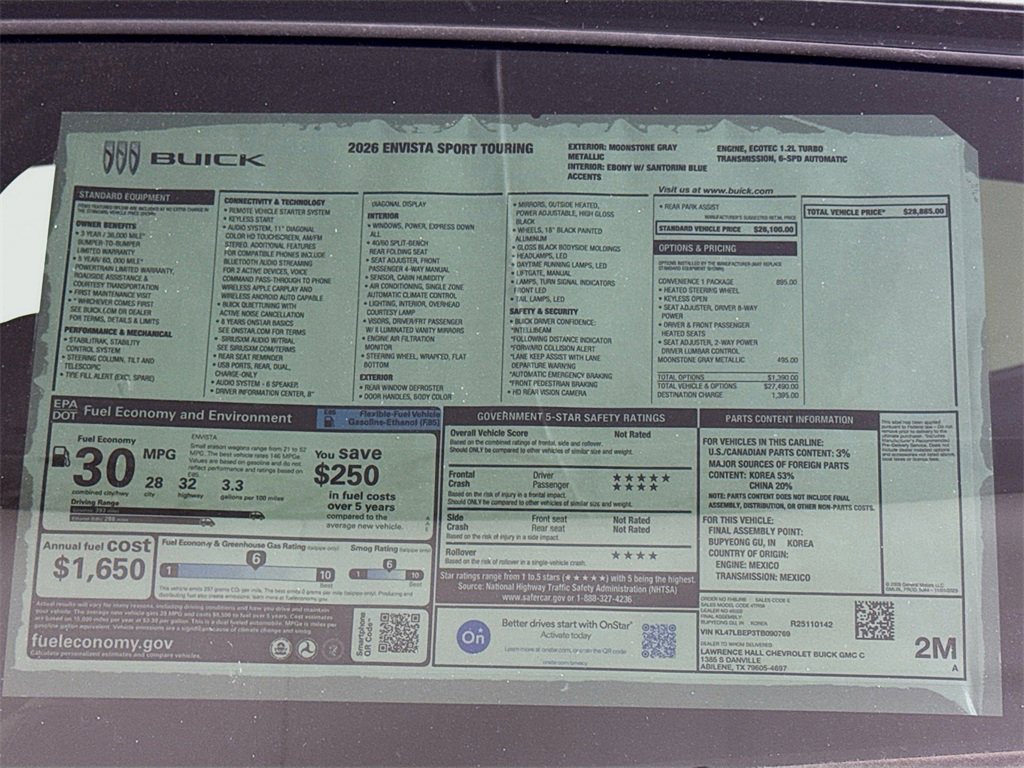 This 2026 Buick Envista Sport Touring New Vehicle Purchase in Moonstone Gray Metallic comes with the following features: 2 USB Ports (1 Type-A, 1 Type-C), 2-Way Power Driver Lumbar Control, 3.50 Final Drive Axle Ratio, 4-Way Manual Front Passenger Seat Adjuster, 4-Wheel Disc Brakes, 6 Speakers, 6-Way Manual Driver Seat Adjuster, 8-Way Power Driver Seat Adjuster, ABS brakes, Air Conditioning, Alloy wheels, AM/FM radio: SiriusXM, Auto High-beam Headlights, Automatic temperature control, Brake assist, Bumpers: body-color, Compass, Convenience I Package, Delay-off headlights, Driver door bin, Driver vanity mirror, Dual front impact airbags, Dual front side impact airbags, Electronic Stability Control, Emergency communication system: OnStar, Exterior Parking Camera Rear, Front anti-roll bar, Front Bucket Seats, Front Center Armrest, Front Doors Keyless Open, Front License Plate Bracket, Front reading lights, Front wheel independent suspension, Fully automatic headlights, Heated door mirrors, Heated Driver and Front Passenger Seats, Heated Steering Wheel, Illuminated entry, Leatherette Seat Trim, Low tire pressure warning, Occupant sensing airbag, Outside temperature display, Overhead airbag, Overhead console, Panic alarm, Passenger door bin, Passenger vanity mirror, Power door mirrors, Power steering, Power windows, Preferred Equipment Group G03, Premium 6-Speaker Audio System Feature, Radio data system, Radio: AM/FM Stereo Audio System, Rear Parking Sensors, Rear window defroster, Remote keyless entry, Security system, SiriusXM Trial Subscription, Speed control, Split folding rear seat, Steering wheel mounted audio controls, Tachometer, Telescoping steering wheel, Tilt steering wheel, Traction control, Trip computer, Turn signal indicator mirrors, Variably intermittent wipers, Wheels: 18 Black Painted Aluminum, Wireless Apple CarPlay/Wireless Android Auto.