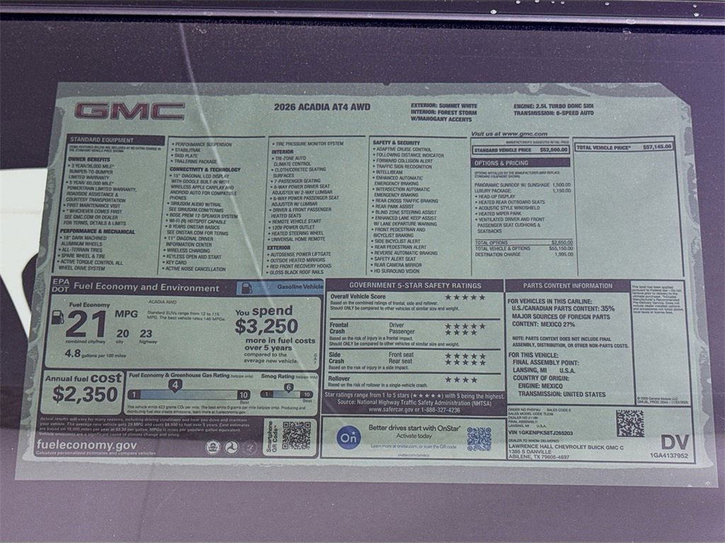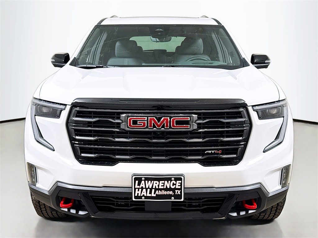 Recent Arrival! This 2026 GMC Acadia AT4 New Vehicle Purchase in Summit White comes with the following features: AWD, Forest Storm W/Mahogany Accents Cloth, 12 Speakers, 3.49 Final Drive Axle Ratio, 3rd row seats: split-bench, 4-Wheel Disc Brakes, 6-Way Power Front Passenger Seat Adjuster, 7-Passenger Seating (2-2-3 Seating Configuration), 8-Way Power Driver Seat Adjuster, 8 Diagonal Head-Up Display, ABS brakes, Air Conditioning, Alloy wheels, AM/FM radio: SiriusXM with 360L, Apple CarPlay/Android Auto, Auto High-beam Headlights, Auto-dimming Rear-View mirror, Automatic temperature control, Bodyside moldings, Bose Premium 12-Speaker System w/Sub-Woofer, Brake assist, Bumpers: body-color, Cloth/CoreTec Seat Trim, Compass, Delay-off headlights, Driver 2-Way Power Lumbar Seat Adjuster, Driver door bin, Driver vanity mirror, Dual front impact airbags, Dual front side impact airbags, Electronic Stability Control, Emergency communication system: OnStar Services capable, Exterior Parking Camera Rear, Four wheel independent suspension, Front anti-roll bar, Front Bucket Seats, Front Center Armrest, Front dual zone A/C, Front fog lights, Front License Plate Bracket, Front Passenger Power Lumbar Seat Adjuster, Front reading lights, Fully automatic headlights, Garage door transmitter, Heated & Ventilated Driver & Front Passenger Seats, Heated door mirrors, Heated Driver & Front Passenger Seats, Heated front seats, Heated Rear Outboard Seating Positions, Heated steering wheel, Heated Wiper Park, Illuminated entry, Laminated Acoustic Glass, Leather steering wheel, Low tire pressure warning, Luxury Package, Navigation System, Occupant sensing airbag, Outside temperature display, Overhead airbag, Overhead console, Panic alarm, Panoramic Power Sunroof w/Sunshade, Passenger door bin, Passenger vanity mirror, Power door mirrors, Power driver seat, Power Liftgate, Power passenger seat, Power steering, Power windows, Preferred Equipment Group 4SB, Radio data system, Radio: 15 Premium GMC Infotainment System, Rear air conditioning, Rear anti-roll bar, Rear reading lights, Rear side impact airbag, Rear window defroster, Rear window wiper, Remote keyless entry, Security system, SiriusXM w/360L, Speed control, Speed-sensing steering, Split folding rear seat, Spoiler, Sport steering wheel, Steering wheel mounted audio controls, Tachometer, Telescoping steering wheel, Tilt steering wheel, Traction control, Trip computer, Turn signal indicator mirrors, Variably intermittent wipers, Voltmeter, Wheels: 18 x 8 Dark Machined Aluminum, AWD, Forest Storm W/Mahogany Accents Cloth.Treat yourself to a friendly and personable car-buying experience by visiting our Chevy dealership in Abilene, TX. Here at Lawrence Hall Chevrolet GMC Buick, we go the extra mile for every guest who walks through our doors. We've been recognized as Abilene's Best New Car Dealer by Abilene Reporter News for over 20 years, so you can trust our experts to take care of all your automotive needs when you stop by. The customer is always the top priority at our Abilene dealership, and we're proud to offer an expansive selection of new and used vehicles. Tax, title and license not included. Vehicle may have dealer accessories added. Pricing may not be compatible with cash, outside finance, or special APR offers. Contact dealer for additional details: $1000 - Buick GMC Bonus Cash. Exp. 03/02/2026