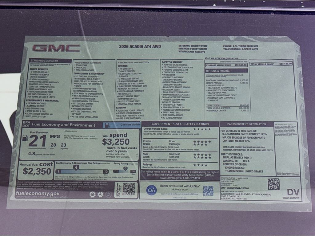This 2026 GMC Acadia AT4 New Vehicle Purchase in Summit White comes with the following features: AWD, Forest Storm W/Mahogany Accents Cloth, 12 Speakers, 3.49 Final Drive Axle Ratio, 3rd row seats: split-bench, 4-Wheel Disc Brakes, 6-Way Power Front Passenger Seat Adjuster, 7-Passenger Seating (2-2-3 Seating Configuration), 8-Way Power Driver Seat Adjuster, 8 Diagonal Head-Up Display, ABS brakes, Air Conditioning, Alloy wheels, AM/FM radio: SiriusXM with 360L, Apple CarPlay/Android Auto, Auto High-beam Headlights, Auto-dimming Rear-View mirror, Automatic temperature control, Bodyside moldings, Bose Premium 12-Speaker System w/Sub-Woofer, Brake assist, Bumpers: body-color, Cloth/CoreTec Seat Trim, Compass, Delay-off headlights, Driver 2-Way Power Lumbar Seat Adjuster, Driver door bin, Driver vanity mirror, Dual front impact airbags, Dual front side impact airbags, Electronic Stability Control, Emergency communication system: OnStar Services capable, Exterior Parking Camera Rear, Four wheel independent suspension, Front anti-roll bar, Front Bucket Seats, Front Center Armrest, Front dual zone A/C, Front fog lights, Front License Plate Bracket, Front Passenger Power Lumbar Seat Adjuster, Front reading lights, Fully automatic headlights, Garage door transmitter, Heated & Ventilated Driver & Front Passenger Seats, Heated door mirrors, Heated Driver & Front Passenger Seats, Heated front seats, Heated Rear Outboard Seating Positions, Heated steering wheel, Heated Wiper Park, Illuminated entry, Laminated Acoustic Glass, Leather steering wheel, Low tire pressure warning, Luxury Package, Navigation System, Occupant sensing airbag, Outside temperature display, Overhead airbag, Overhead console, Panic alarm, Panoramic Power Sunroof w/Sunshade, Passenger door bin, Passenger vanity mirror, Power door mirrors, Power driver seat, Power Liftgate, Power passenger seat, Power steering, Power windows, Preferred Equipment Group 4SB, Radio data system, Radio: 15 Premium GMC Infotainment System, Rear air conditioning, Rear anti-roll bar, Rear reading lights, Rear side impact airbag, Rear window defroster, Rear window wiper, Remote keyless entry, Security system, SiriusXM w/360L, Speed control, Speed-sensing steering, Split folding rear seat, Spoiler, Sport steering wheel, Steering wheel mounted audio controls, Tachometer, Telescoping steering wheel, Tilt steering wheel, Traction control, Trip computer, Turn signal indicator mirrors, Variably intermittent wipers, Voltmeter, Wheels: 18 x 8 Dark Machined Aluminum, AWD, Forest Storm W/Mahogany Accents Cloth.