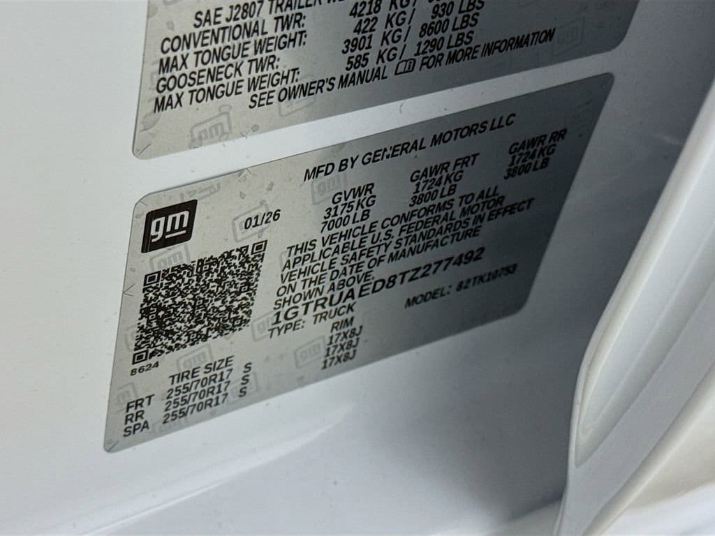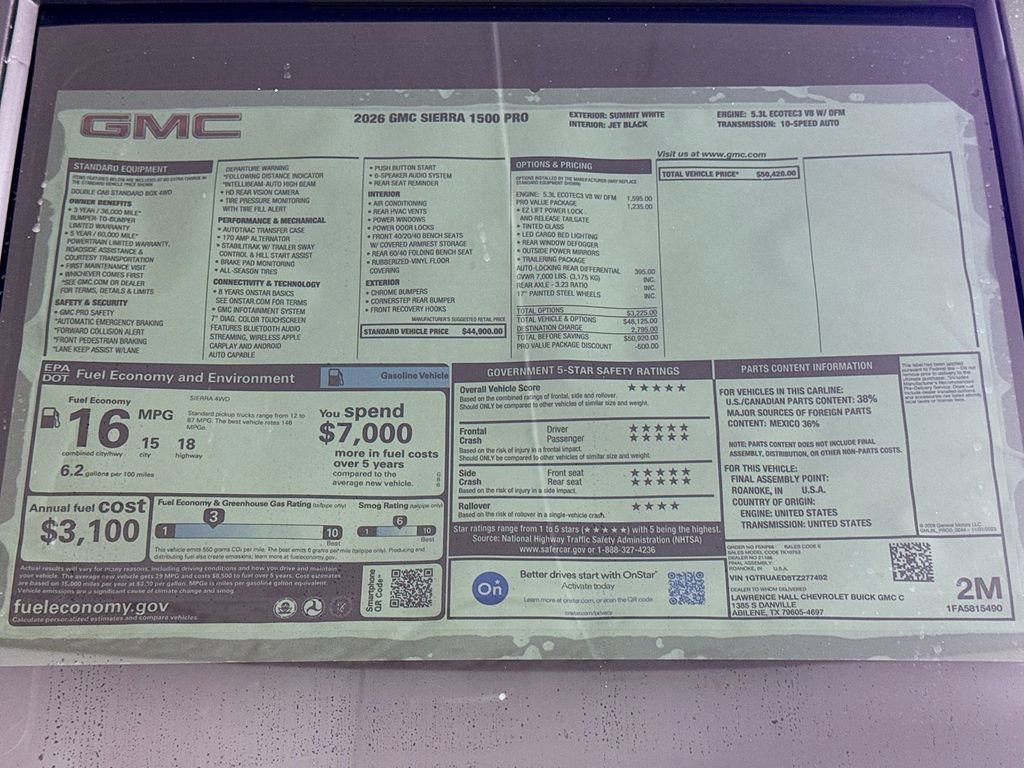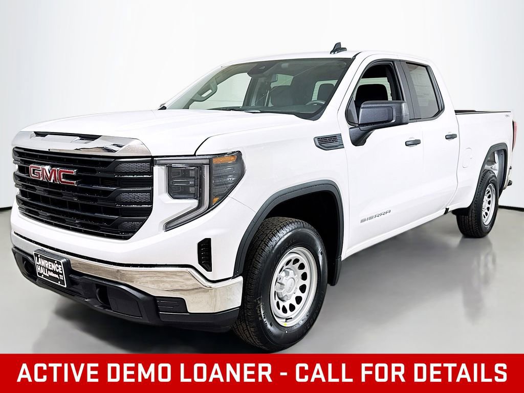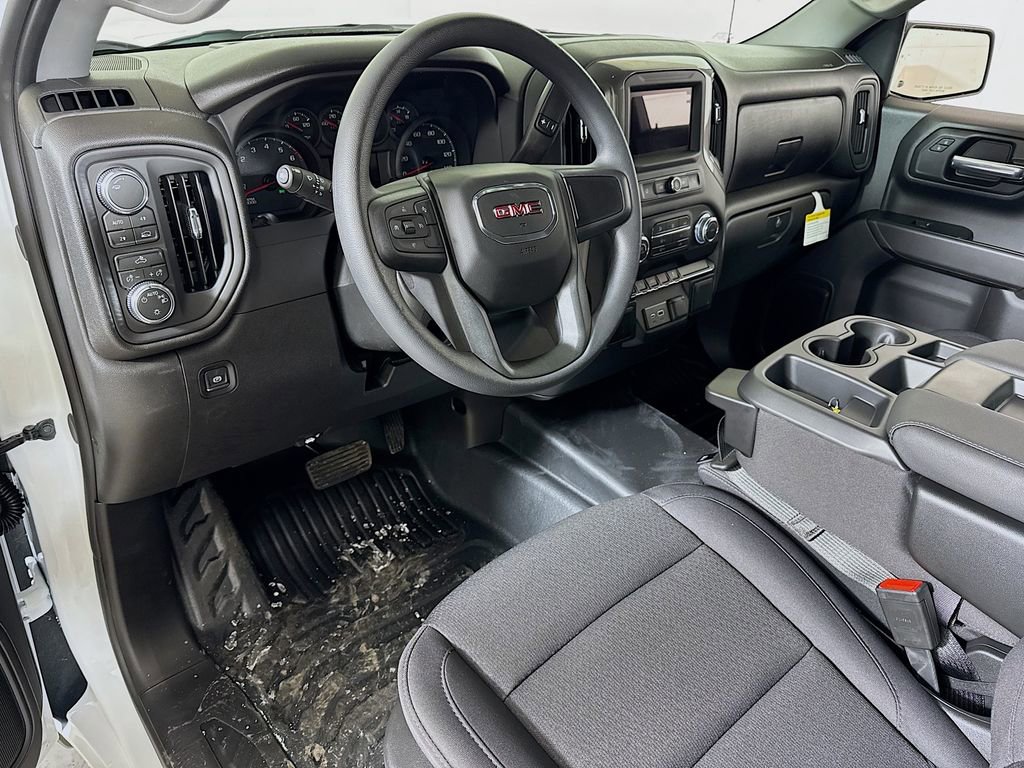 This 2026 GMC Sierra 1500 Pro Loaner in Summit White comes with the following features: 10-Speed Automatic, 4WD, Jet Black Vinyl, 170 Amp Alternator, 2 Charge/Data USB Ports, 220 Amp Alternator, 4-Way Manual Driver Seat Adjuster, 4-Way Manual Passenger Seat Adjuster, 4-Wheel Disc Brakes, 6 Speakers, 6-Speaker Audio System Feature, ABS brakes, Air Conditioning, AM/FM radio, Apple CarPlay/Android Auto, Auto High-beam Headlights, Auto-Locking Rear Differential, Automatic Emergency Braking, Auxiliary External Transmission Oil Cooler, Brake assist, Buckle to Drive, Bumpers: chrome, Chrome Header with Flat Black Grille Insert Bars, Compass, Convenience Package, Deep-Tinted Glass, Delay-off headlights, Driver door bin, Dual front impact airbags, Dual front side impact airbags, Electric Rear-Window Defogger, Electronic Stability Control, Emergency communication system: OnStar, External Engine Oil Cooling, EZ Lift Power Lock and Release Tailgate, Following Distance Indicator, Forward Collision Alert, Front 40/20/40 Split-Bench Seat, Front anti-roll bar, Front Center Armrest w/Storage, Front Frame-Mounted Black Recovery Hooks, Front License Plate Kit, Front Pedestrian Braking, Front reading lights, Front wheel independent suspension, Fully automatic headlights, HD Rear Vision Camera, Heated Power-Adjustable Outside Mirrors, Hitch Guidance, Illuminated entry, IntelliBeam Automatic High Beam on/Off, Lane Keep Assist with Lane Departure Warning, LED Cargo Area Lighting, Low tire pressure warning, Occupant sensing airbag, OnStar Services Capable, Outside temperature display, Overhead airbag, Overhead console, Panic alarm, Passenger door bin, Passenger vanity mirror, Power Door Locks, Power Front Windows with Driver Express Up/Down, Power Front Windows with Passenger Express Down, Power Rear Windows with Express Down, Power steering, Power windows, Preferred Equipment Group 1SA, Pro Value Package, Push Button Start, Radio data system, Radio: GMC Infotainment Audio System, Rear reading lights, Rear step bumper, Remote Keyless Entry, Remote keyless entry, Solar Absorbing Tinted Glass, Speed control, Speed-sensing steering, Split folding rear seat, Standard Suspension Package, Tachometer, Tilt steering wheel, Traction control, Trailering Package, Trip computer, Variably intermittent wipers, Vinyl Seat Trim, Voltmeter, Wheels: 17 x 8 Silver Painted Steel, Wi-Fi Hotspot Capable, Wireless Apple CarPlay/Wireless Android Auto, 10-Speed Automatic, 4WD, Jet Black Vinyl.