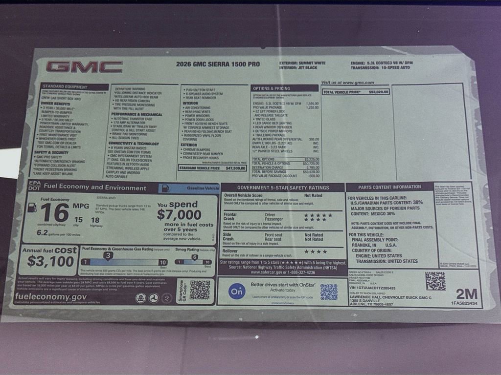 This 2026 GMC Sierra 1500 Pro New Vehicle Purchase in Summit White comes with the following features: 10-Speed Automatic, 4WD, Jet Black Vinyl, 170 Amp Alternator, 2 Charge/Data USB Ports, 220 Amp Alternator, 4-Way Manual Driver Seat Adjuster, 4-Way Manual Passenger Seat Adjuster, 4-Wheel Disc Brakes, 6 Speakers, 6-Speaker Audio System Feature, ABS brakes, Air Conditioning, AM/FM radio, Apple CarPlay/Android Auto, Auto High-beam Headlights, Auto-Locking Rear Differential, Automatic Emergency Braking, Auxiliary External Transmission Oil Cooler, Brake assist, Buckle to Drive, Bumpers: chrome, Chrome Header with Flat Black Grille Insert Bars, Compass, Convenience Package, Deep-Tinted Glass, Delay-off headlights, Driver door bin, Dual front impact airbags, Dual front side impact airbags, Electric Rear-Window Defogger, Electronic Stability Control, Emergency communication system: OnStar, External Engine Oil Cooling, EZ Lift Power Lock and Release Tailgate, Following Distance Indicator, Forward Collision Alert, Front 40/20/40 Split-Bench Seat, Front anti-roll bar, Front Center Armrest w/Storage, Front Frame-Mounted Black Recovery Hooks, Front License Plate Kit, Front Pedestrian Braking, Front reading lights, Front wheel independent suspension, Fully automatic headlights, HD Rear Vision Camera, Heated Power-Adjustable Outside Mirrors, Hitch Guidance, Illuminated entry, IntelliBeam Automatic High Beam on/Off, Lane Keep Assist with Lane Departure Warning, LED Cargo Area Lighting, Low tire pressure warning, Occupant sensing airbag, OnStar Services Capable, Outside temperature display, Overhead airbag, Overhead console, Panic alarm, Passenger door bin, Passenger vanity mirror, Power Door Locks, Power Front Windows with Driver Express Up/Down, Power Front Windows with Passenger Express Down, Power Rear Windows with Express Down, Power steering, Power windows, Preferred Equipment Group 1SA, Pro Value Package, Push Button Start, Radio data system, Radio: GMC Infotainment Audio System, Rear reading lights, Rear step bumper, Remote Keyless Entry, Remote keyless entry, Solar Absorbing Tinted Glass, Speed control, Speed-sensing steering, Split folding rear seat, Standard Suspension Package, Tachometer, Tilt steering wheel, Traction control, Trailering Package, Trip computer, Variably intermittent wipers, Vinyl Seat Trim, Voltmeter, Wheels: 17 x 8 Silver Painted Steel, Wi-Fi Hotspot Capable, Wireless Apple CarPlay/Wireless Android Auto, 10-Speed Automatic, 4WD, Jet Black Vinyl.