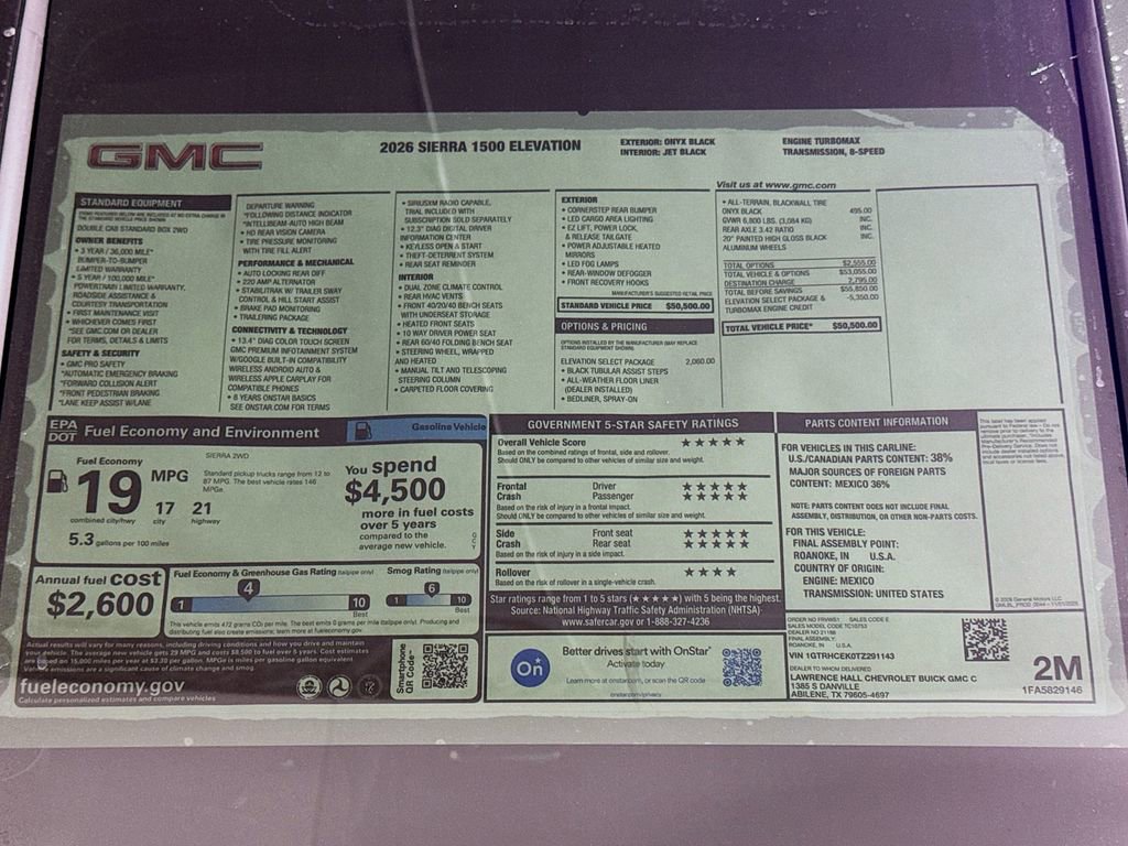 This 2026 GMC Sierra 1500 Elevation New Vehicle Purchase in Onyx Black comes with the following features: 8-Speed Automatic, Black Cloth, 10-Way Power Driver Seat Adjuster with Lumbar, 120-Volt Bed Mounted Power Outlet, 120-Volt Interior Power Outlet, 2 Charge/Data USB Ports, 2 Type-C Charge-Only Rear USB Ports, 220 Amp Alternator, 3.42 Rear Axle Ratio, 4-Way Manual Passenger Seat Adjuster, 4-Wheel Disc Brakes, 4 Round Black Tubular Assist Steps, 6 Speakers, 6-Speaker Audio System Feature, ABS brakes, Air Conditioning, All-Weather Floor Liner, Alloy wheels, AM/FM radio: SiriusXM with 360L, Apple CarPlay/Android Auto, Auto High-beam Headlights, Auto-Locking Rear Differential, Automatic Emergency Braking, Automatic temperature control, Body Color Header with Gloss Black Mesh Grille Bars, Brake assist, Buckle to Drive, Bumpers: body-color, Cloth Seat Trim, Color-Keyed Carpeting Floor Covering, Compass, Deep-Tinted Glass, Delay-off headlights, Driver door bin, Driver vanity mirror, Dual front impact airbags, Dual front side impact airbags, Electric Rear-Window Defogger, Electronic Stability Control, Elevation Select Package, Emergency communication system: OnStar, Following Distance Indicator, Forward Collision Alert, Front 40/20/40 Split-Bench Seat, Front anti-roll bar, Front Center Armrest w/Storage, Front dual zone A/C, Front fog lights, Front Frame-Mounted Black Recovery Hooks, Front License Plate Kit, Front Pedestrian Braking, Front reading lights, Front Rubberized-Vinyl Floor Mats, Front wheel independent suspension, Fully automatic headlights, HD Rear Vision Camera, Heated door mirrors, Heated Driver and Front Outboard Passenger Seating, Heated front seats, Heated steering wheel, High Capacity Suspension Package, Hitch Guidance, Illuminated entry, Integrated Trailer Brake Controller, IntelliBeam Automatic High Beam on/Off, Keyless Open and Start, Lane Keep Assist with Lane Departure Warning, LED Cargo Area Lighting, Low tire pressure warning, Manual Tilt-Wheel and Telescoping Steering Column, Navigation System, Occupant sensing airbag, OnStar Services Capable, Outside temperature display, Overhead airbag, Overhead console, Panic alarm, Passenger door bin, Passenger vanity mirror, Power Door Locks, Power door mirrors, Power driver seat, Power Front Windows with Driver Express Up/Down, Power Front Windows with Passenger Express Down, Power Rear Windows with Express Down, Power steering, Power windows, Preferred Equipment Group 3SB, Push Button Start, Radio data system, Radio: Premium GMC Infotainment Audio System, Rear reading lights, Rear Rubberized-Vinyl Floor Mats, Rear step bumper, Rear window defroster, Remote keyless entry, Remote Vehicle Starter System, Security system, SiriusXM with 360L Trial Subscription, Speed control, Speed-sensing steering, Split folding rear seat, Spray-on Pickup Bedliner with GMC Logo, Steering Wheel Audio Controls, Steering wheel mounted audio controls, Tachometer, Telescoping steering wheel, Theft Deterrent System (unauthorized Entry), Tilt steering wheel, Traction control, Trailering Package, Trip computer, Variably intermittent wipers, Voltmeter, Wheels: : 20 x 9 High Gloss Black Painted Aluminum, Wi-Fi Hotspot Capable, Wireless Apple CarPlay/Wireless Android Auto, 8-Speed Automatic, Black Cloth.