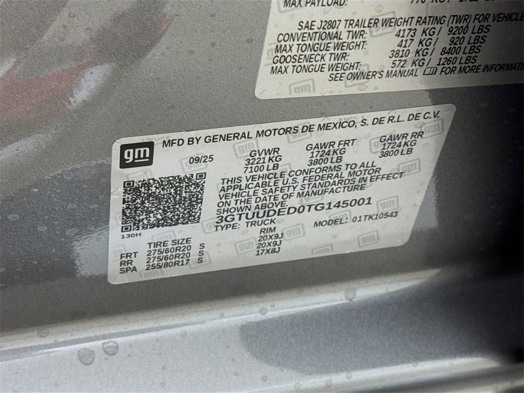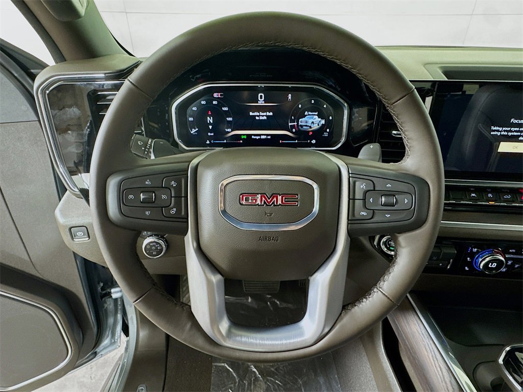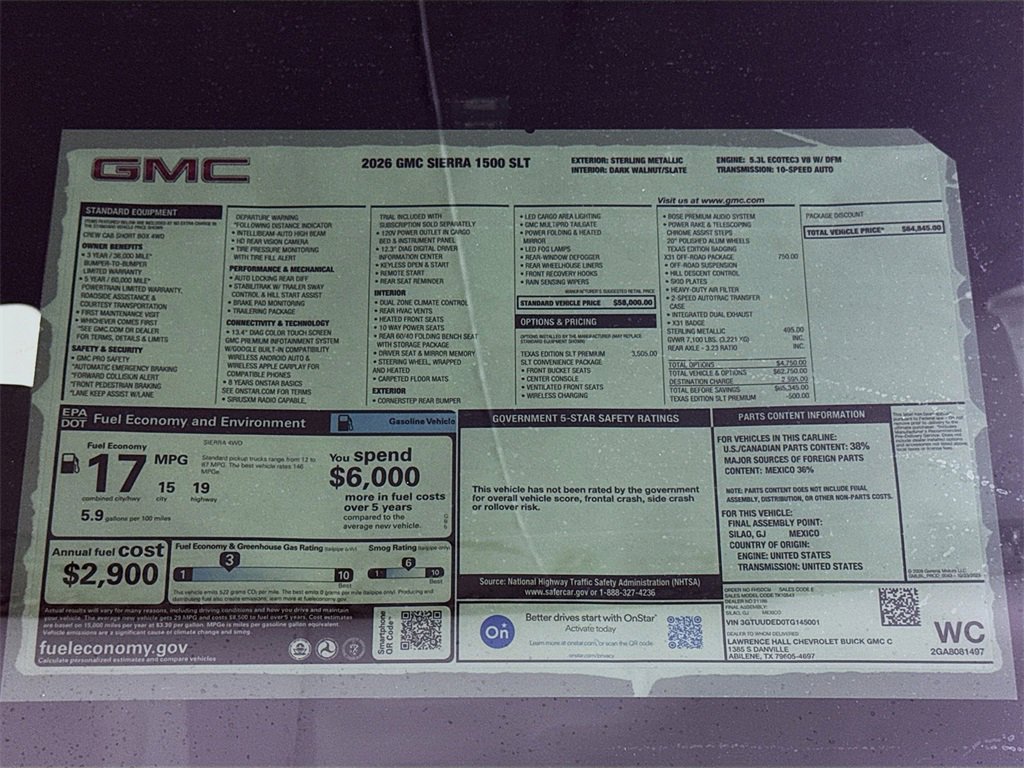 This 2026 GMC Sierra 1500 SLT New Vehicle Purchase in Sterling Metallic comes with the following features: 10-Speed Automatic, 4WD, Dark Walnut/Slate Leather, 10-Way Power Driver Seat Adjuster w/Lumbar, 10-Way Power Passenger Seat Adjuster w/Lumbar, 120-Volt Bed Mounted Power Outlet, 120-Volt Interior Power Outlet, 170 Amp Alternator, 2 Charge/Data USB Ports, 2 Type-C Charge-Only Rear USB Ports, 3.23 Rear Axle Ratio, 4-Wheel Disc Brakes, 6 Speakers, 6-Speaker Audio System Feature, ABS brakes, Air Conditioning, Alloy wheels, AM/FM radio: SiriusXM with 360L, Apple CarPlay/Android Auto, Auto High-beam Headlights, Auto-dimming door mirrors, Auto-dimming Rear-View mirror, Auto-Locking Rear Differential, Automatic Emergency Braking, Automatic temperature control, Auxiliary External Transmission Oil Cooler, Brake assist, Buckle to Drive, Bumpers: chrome, Chrome Header & Chrome Grille Insert Bars, Color-Keyed Carpeting Floor Covering, Compass, Deep-Tinted Glass, Delay-off headlights, Driver door bin, Driver Memory, Driver vanity mirror, Dual front impact airbags, Dual front side impact airbags, Electric Rear-Window Defogger, Electronic Stability Control, Emergency communication system: OnStar, Following Distance Indicator, Forward Collision Alert, Front 40/20/40 Split-Bench Seat, Front anti-roll bar, Front Center Armrest w/Storage, Front dual zone A/C, Front fog lights, Front Frame-Mounted Black Recovery Hooks, Front Pedestrian Braking, Front Rain-Sensing Wipers, Front reading lights, Front wheel independent suspension, Fully automatic headlights, HD Rear Vision Camera, Heated door mirrors, Heated Driver & Front Outboard Passenger Seating, Heated front seats, Heated steering wheel, Hitch Guidance, Illuminated entry, Integrated Trailer Brake Controller, IntelliBeam Automatic High Beam On/Off, Keyless Open & Start, Lane Keep Assist w/Lane Departure Warning, LED Cargo Area Lighting, Low tire pressure warning, Manual Tilt-Wheel & Telescoping Steering Column, Memory seat, Navigation System, Occupant sensing airbag, OnStar Services Capable, Outside temperature display, Overhead airbag, Overhead console, Panic alarm, Passenger door bin, Passenger vanity mirror, Perf Leather-Appointed Front Outboard Seat Trim, Perimeter Lighting, Power Door Locks, Power door mirrors, Power driver seat, Power Front Passenger Windows w/Express Up/Down, Power Front Windows w/Driver Express Up/Down, Power passenger seat, Power Rear Windows w/Express Down, Power steering, Power windows, Preferred Equipment Group 4SA, Push Button Start, Radio data system, Radio: Premium GMC Infotainment Audio System, Rain sensing wipers, Rear reading lights, Rear seat center armrest, Rear step bumper, Rear Wheelhouse Liners, Rear window defroster, Remote keyless entry, Remote Vehicle Starter System, Security system, SiriusXM w/360L Trial Subscription, Speed control, Speed-sensing steering, Split folding rear seat, Standard Suspension Package, Steering Wheel Audio Controls, Steering wheel mounted audio controls, Tachometer, Telescoping steering wheel, Theft Deterrent System (Unauthorized Entry), Tilt steering wheel, Traction control, Trailering Package, Trip computer, Variably intermittent wipers, Voltmeter, Wheels: 18 x 8.5 6-Spoke Machined Aluminum, Wi-Fi Hotspot Capable, Wireless Apple CarPlay/Wireless Android Auto, 10-Speed Automatic, 4WD, Dark Walnut/Slate Leather.