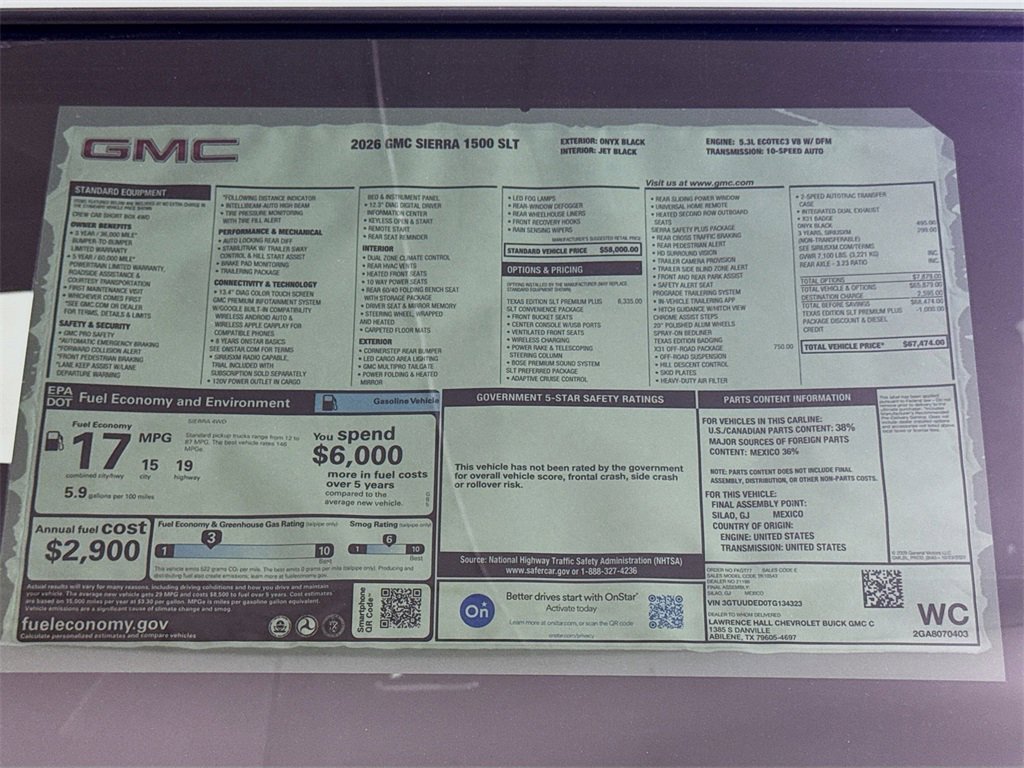 This 2026 GMC Sierra 1500 SLT New Vehicle Purchase in Onyx Black comes with the following features: 10-Speed Automatic, 4WD, Black Leather, 120-Volt Bed Mounted Power Outlet, 120-Volt Interior Power Outlet, 170 Amp Alternator, 2 Charge/Data USB Ports, 2 Charge/Data USB Ports Inside Center Console, 2 Type-C Charge-Only Rear USB Ports, 20 Polished Aluminum Wheels, 3 Years SiriusXM, 3.23 Rear Axle Ratio, 4-Wheel Disc Brakes, 6 Speakers, 6-Speaker Audio System Feature, ABS brakes, Adaptive Cruise Control, Air Conditioning, Alloy wheels, AM/FM radio: SiriusXM with 360L, Apple CarPlay/Android Auto, Auto High-beam Headlights, Auto-dimming door mirrors, Auto-dimming Rear-View mirror, Auto-Locking Rear Differential, Automatic Emergency Braking, Automatic temperature control, Auxiliary External Transmission Oil Cooler, Brake assist, Buckle to Drive, Bumpers: chrome, Chrome Header & Chrome Grille Insert Bars, Chrome Wheel To Wheel Assist Steps, Color-Keyed Carpeting Floor Covering, Compass, Deep-Tinted Glass, Delay-off headlights, Driver door bin, Driver Memory, Driver vanity mirror, Dual Exhaust System, Dual front impact airbags, Dual front side impact airbags, Electric Rear-Window Defogger, Electronic Precision Shift, Electronic Stability Control, Emergency communication system: OnStar, Floor-Mounted Center Console, Following Distance Indicator, Forward Collision Alert, Front 40/20/40 Split-Bench Seat, Front anti-roll bar, Front Bucket Seats, Front Center Armrest w/Storage, Front dual zone A/C, Front fog lights, Front Frame-Mounted Black Recovery Hooks, Front License Plate Kit, Front Pedestrian Braking, Front Rain-Sensing Wipers, Front reading lights, Front wheel independent suspension, Fully automatic headlights, HD Rear Vision Camera, HD Surround Vision, Heated 2nd Row Outboard Seats, Heated door mirrors, Heated front seats, Heated steering wheel, Heavy-Duty Air Filter, High Capacity Suspension Package, Hill Descent Control, Hitch Guidance, Hitch View, Illuminated entry, In-Vehicle Trailering System App, Integrated Trailer Brake Controller, LED Cargo Area Lighting, Low tire pressure warning, Manual Tilt-Wheel & Telescoping Steering Column, Memory seat, Navigation System, Occupant sensing airbag, Off-Road Suspension, OnStar Services Capable, Outside temperature display, Overhead airbag, Overhead console, Panic alarm, Passenger door bin, Passenger vanity mirror, Perf Leather-Appointed Front Outboard Seat Trim, Perimeter Lighting, Power Door Locks, Power door mirrors, Power driver seat, Power Front Passenger Windows w/Express Up/Down, Power passenger seat, Power Rake & Telescoping Steering Column, Power steering, Power windows, Preferred Equipment Group 4SA, Premium Bose 7-Speaker Sound System, ProGrade Trailering System, Push Button Start, Radio data system, Radio: Premium GMC Infotainment Audio System, Rain sensing wipers, Rear Cross Traffic Braking, Rear Pedestrian Detection, Rear reading lights, Rear seat center armrest, Rear step bumper, Rear Wheelhouse Liners, Rear window defroster, Remote keyless entry, Remote Vehicle Starter System, Safety Alert Seat, Security system, Sierra Safety Plus Package, SLT Convenience Package, SLT Preferred Package, Speed control, Speed-sensing steering, Split folding rear seat, Spray-On Pickup Bedliner w/GMC Logo, Standard Suspension Package, Steering Wheel Audio Controls, Steering wheel mounted audio controls, Tachometer, Telescoping steering wheel, Texas Edition Badging, Texas Edition SLT Premium Plus Package, Theft Deterrent System (Unauthorized Entry), Tilt steering wheel, Traction control, Trailer Camera Provisions, Trailer Side Blind Zone Alert, Trailering Package, Trip computer, Ultrasonic Tax, title and license not included. Vehicle may have dealer accessories added. Pricing may not be compatible with cash, outside finance, or special APR offers. Contact dealer for additional details: $1500 - Buick GMC Bonus Cash. Exp. 03/02/2026 $1750 - Buic