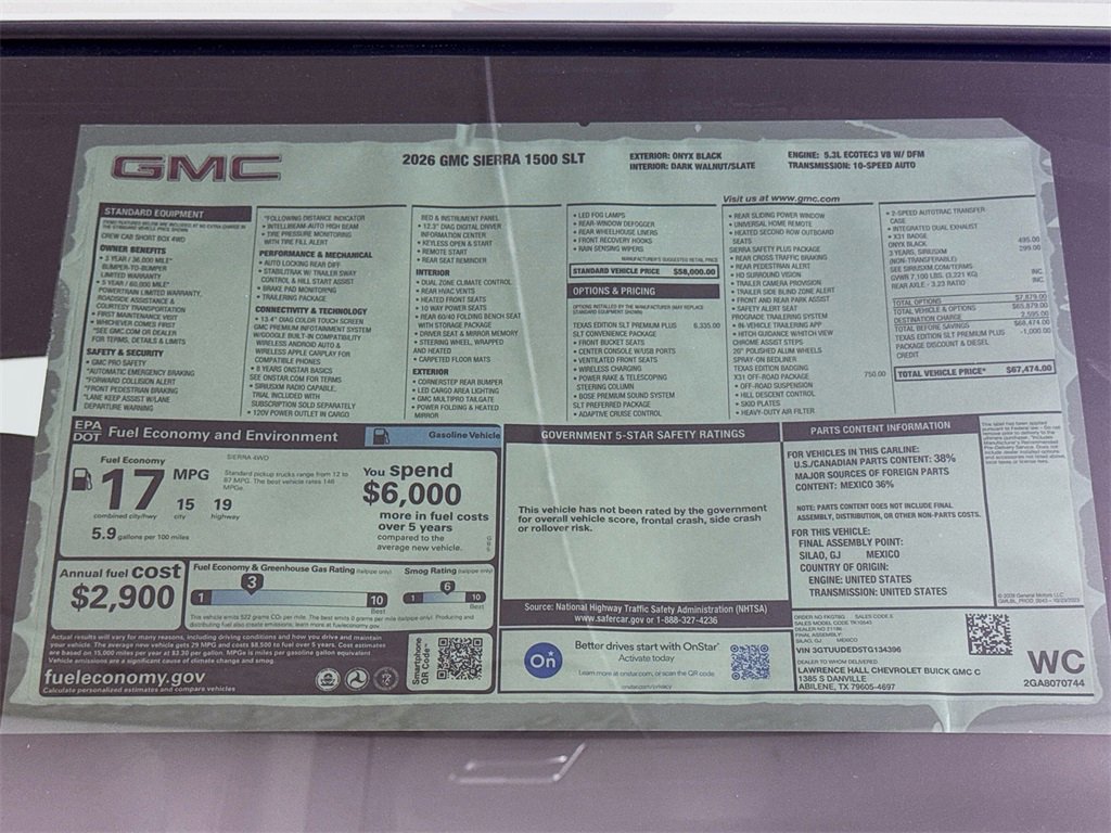 This 2026 GMC Sierra 1500 SLT New Vehicle Purchase in Onyx Black comes with the following features: 10-Speed Automatic, 4WD, Dark Walnut/Slate Leather, 120-Volt Bed Mounted Power Outlet, 120-Volt Interior Power Outlet, 170 Amp Alternator, 2 Charge/Data USB Ports, 2 Charge/Data USB Ports Inside Center Console, 2 Type-C Charge-Only Rear USB Ports, 20 Polished Aluminum Wheels, 3 Years SiriusXM, 3.23 Rear Axle Ratio, 4-Wheel Disc Brakes, 6 Speakers, 6-Speaker Audio System Feature, ABS brakes, Adaptive Cruise Control, Air Conditioning, Alloy wheels, AM/FM radio: SiriusXM with 360L, Apple CarPlay/Android Auto, Auto High-beam Headlights, Auto-dimming door mirrors, Auto-dimming Rear-View mirror, Auto-Locking Rear Differential, Automatic Emergency Braking, Automatic temperature control, Auxiliary External Transmission Oil Cooler, Brake assist, Buckle to Drive, Bumpers: chrome, Chrome Header & Chrome Grille Insert Bars, Chrome Wheel To Wheel Assist Steps, Color-Keyed Carpeting Floor Covering, Compass, Deep-Tinted Glass, Delay-off headlights, Driver door bin, Driver Memory, Driver vanity mirror, Dual Exhaust System, Dual front impact airbags, Dual front side impact airbags, Electric Rear-Window Defogger, Electronic Precision Shift, Electronic Stability Control, Emergency communication system: OnStar, Floor-Mounted Center Console, Following Distance Indicator, Forward Collision Alert, Front 40/20/40 Split-Bench Seat, Front anti-roll bar, Front Bucket Seats, Front Center Armrest w/Storage, Front dual zone A/C, Front fog lights, Front Frame-Mounted Black Recovery Hooks, Front License Plate Kit, Front Pedestrian Braking, Front Rain-Sensing Wipers, Front reading lights, Front wheel independent suspension, Fully automatic headlights, HD Rear Vision Camera, HD Surround Vision, Heated 2nd Row Outboard Seats, Heated door mirrors, Heated front seats, Heated steering wheel, Heavy-Duty Air Filter, High Capacity Suspension Package, Hill Descent Control, Hitch Guidance, Hitch View, Illuminated entry, In-Vehicle Trailering System App, Integrated Trailer Brake Controller, LED Cargo Area Lighting, Low tire pressure warning, Manual Tilt-Wheel & Telescoping Steering Column, Memory seat, Navigation System, Occupant sensing airbag, Off-Road Suspension, OnStar Services Capable, Outside temperature display, Overhead airbag, Overhead console, Panic alarm, Passenger door bin, Passenger vanity mirror, Perf Leather-Appointed Front Outboard Seat Trim, Perimeter Lighting, Power Door Locks, Power door mirrors, Power driver seat, Power Front Passenger Windows w/Express Up/Down, Power passenger seat, Power Rake & Telescoping Steering Column, Power steering, Power windows, Preferred Equipment Group 4SA, Premium Bose 7-Speaker Sound System, ProGrade Trailering System, Push Button Start, Radio data system, Radio: Premium GMC Infotainment Audio System, Rain sensing wipers, Rear Cross Traffic Braking, Rear Pedestrian Detection, Rear reading lights, Rear seat center armrest, Rear step bumper, Rear Wheelhouse Liners, Rear window defroster, Remote keyless entry, Remote Vehicle Starter System, Safety Alert Seat, Security system, Sierra Safety Plus Package, SLT Convenience Package, SLT Preferred Package, Speed control, Speed-sensing steering, Split folding rear seat, Spray-On Pickup Bedliner w/GMC Logo, Standard Suspension Package, Steering Wheel Audio Controls, Steering wheel mounted audio controls, Tachometer, Telescoping steering wheel, Texas Edition Badging, Texas Edition SLT Premium Plus Package, Theft Deterrent System (Unauthorized Entry), Tilt steering wheel, Traction control, Trailer Camera Provisions, Trailer Side Blind Zone Alert, Trailering Package, Trip computer Tax, title and license not included. Vehicle may have dealer accessories added. Pricing may not be compatible with cash, outside finance, or special APR offers. Contact dealer for additional details: $1500 - Buick GMC Bonus Cash. Exp. 03/02/2026 $1750 - Buic
