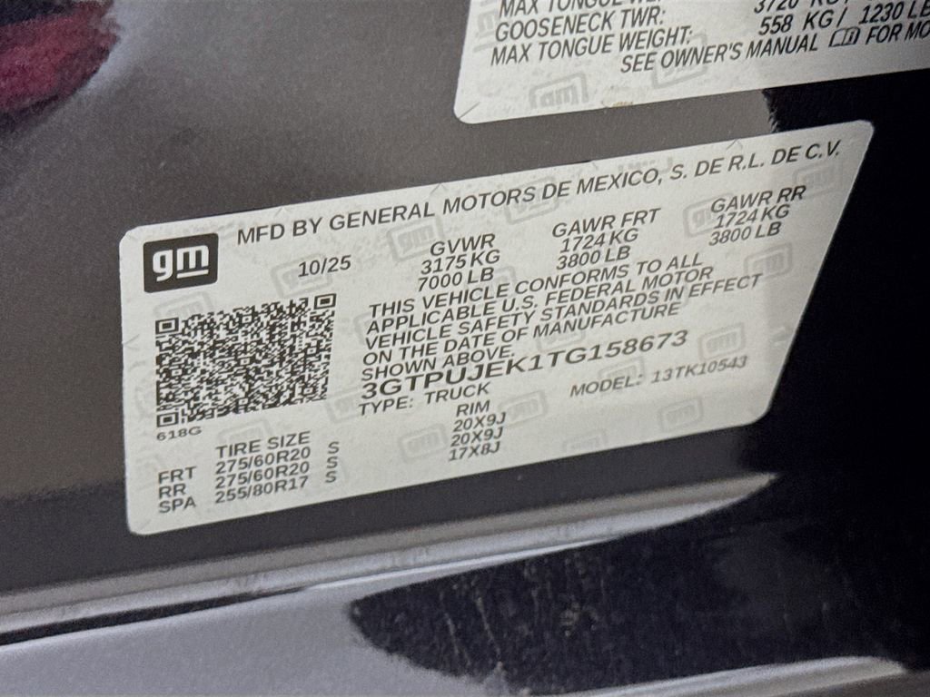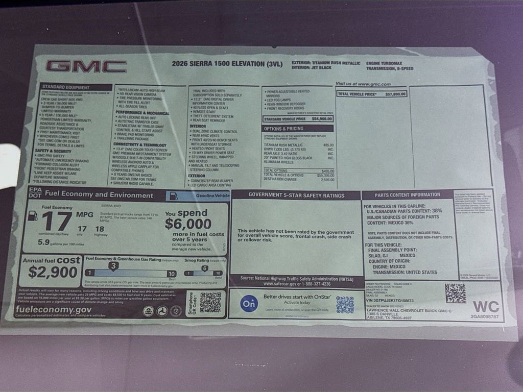 This 2026 GMC Sierra 1500 Elevation New Vehicle Purchase in Titanium Rush Metallic comes with the following features: 8-Speed Automatic, 4WD, Black Cloth, 120-Volt Bed Mounted Power Outlet, 120-Volt Interior Power Outlet, 2 Charge/Data USB Ports, 2 Type-C Charge-Only Rear USB Ports, 220 Amp Alternator, 3.42 Rear Axle Ratio, 4-Way Manual Passenger Seat Adjuster, 4-Wheel Disc Brakes, 6 Speakers, 6-Speaker Audio System Feature, ABS brakes, Air Conditioning, Alloy wheels, AM/FM radio: SiriusXM with 360L, Apple CarPlay/Android Auto, Auto High-beam Headlights, Auto-Locking Rear Differential, Automatic Emergency Braking, Automatic temperature control, Brake assist, Buckle to Drive, Bumpers: body-color, Cloth Seat Trim, Color-Keyed Carpeting Floor Covering, Compass, Deep-Tinted Glass, Delay-off headlights, Driver door bin, Driver vanity mirror, Dual front impact airbags, Dual front side impact airbags, Electric Rear-Window Defogger, Electronic Stability Control, Emergency communication system: OnStar, Following Distance Indicator, Forward Collision Alert, Front 40/20/40 Split-Bench Seat, Front anti-roll bar, Front Center Armrest w/Storage, Front dual zone A/C, Front fog lights, Front Frame-Mounted Black Recovery Hooks, Front License Plate Kit, Front Pedestrian Braking, Front reading lights, Front Rubberized-Vinyl Floor Mats, Front wheel independent suspension, Fully automatic headlights, HD Rear Vision Camera, Heated door mirrors, Heated front seats, Heated steering wheel, High Capacity Suspension Package, Hitch Guidance, Illuminated entry, Integrated Trailer Brake Controller, LED Cargo Area Lighting, Low tire pressure warning, Navigation System, Occupant sensing airbag, OnStar Services Capable, Outside temperature display, Overhead airbag, Overhead console, Panic alarm, Passenger door bin, Passenger vanity mirror, Power Door Locks, Power door mirrors, Power driver seat, Power steering, Power windows, Push Button Start, Radio data system, Radio: Premium GMC Infotainment Audio System, Rear reading lights, Rear Rubberized-Vinyl Floor Mats, Rear seat center armrest, Rear step bumper, Rear window defroster, Remote keyless entry, Remote Vehicle Starter System, Security system, Speed control, Speed-sensing steering, Split folding rear seat, Steering Wheel Audio Controls, Steering wheel mounted audio controls, Tachometer, Telescoping steering wheel, Tilt steering wheel, Traction control, Trailering Package, Trip computer, Variably intermittent wipers, Voltmeter, Wi-Fi Hotspot Capable, Wireless Apple CarPlay/Wireless Android Auto, 8-Speed Automatic, 4WD, Black Cloth.