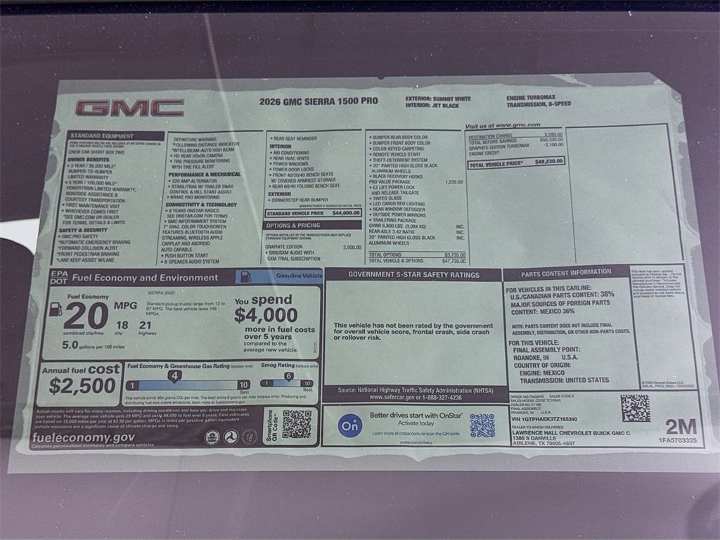 This 2026 GMC Sierra 1500 Pro Loaner in Summit White comes with the following features: 8-Speed Automatic, Black Cloth, 2 Charge/Data USB Ports, 220 Amp Alternator, 3.42 Rear Axle Ratio, 4-Way Manual Driver Seat Adjuster, 4-Way Manual Passenger Seat Adjuster, 4-Wheel Disc Brakes, 6 Speakers, 6-Speaker Audio System Feature, ABS brakes, Air Conditioning, AM/FM radio, Apple CarPlay/Android Auto, Auto High-beam Headlights, Automatic Emergency Braking, Body Color Lower Front Bumper, Body Color Upper Grille, Brake assist, Buckle to Drive, Bumpers: chrome, Color-Keyed Carpeting Floor Covering, Compass, Convenience Package, Deep-Tinted Glass, Delay-off headlights, Driver door bin, Dual front impact airbags, Dual front side impact airbags, Electric Rear-Window Defogger, Electronic Stability Control, Emergency communication system: OnStar, Following Distance Indicator, Forward Collision Alert, Front 40/20/40 Split-Bench Seat, Front anti-roll bar, Front Center Armrest w/Storage, Front Frame-Mounted Black Recovery Hooks, Front License Plate Kit, Front Pedestrian Braking, Front reading lights, Front Rubberized-Vinyl Floor Mats, Front wheel independent suspension, Fully automatic headlights, Graphite Edition, HD Rear Vision Camera, Heated Power-Adjustable Outside Mirrors, High Capacity Suspension Package, Hitch Guidance, Illuminated entry, LED Cargo Area Lighting, Low tire pressure warning, Occupant sensing airbag, OnStar Services Capable, Outside temperature display, Overhead airbag, Overhead console, Panic alarm, Passenger door bin, Passenger vanity mirror, Power Door Locks, Power steering, Power windows, Preferred Equipment Group 1SA, Pro Value Package, Push Button Start, Radio data system, Radio: GMC Infotainment Audio System, Rear Body-Color Bumper, Rear reading lights, Rear Rubberized-Vinyl Floor Mats, Rear step bumper, Remote Keyless Entry, Remote keyless entry, Remote Vehicle Starter System, SiriusXM Trial Subscription, Solar Absorbing Tinted Glass, Speed control, Speed-sensing steering, Split folding rear seat, Standard Suspension Package, Tachometer, Tilt steering wheel, Traction control, Trailering Package, Trip computer, Variably intermittent wipers, Vinyl Seat Trim, Voltmeter, Wheels: 17 x 8 Silver Painted Steel, Wi-Fi Hotspot Capable, Wireless Apple CarPlay/Wireless Android Auto, 8-Speed Automatic, Black Cloth.