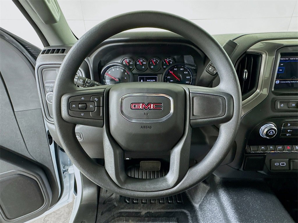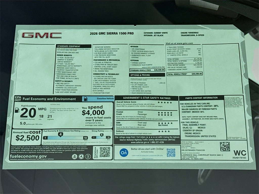 This 2026 GMC Sierra 1500 Pro New Vehicle Purchase in Summit White comes with the following features: 8-Speed Automatic, Jet Black Vinyl, 2 Charge/Data USB Ports, 2 Speakers, 2-Speaker Audio System Feature, 220 Amp Alternator, 3.42 Rear Axle Ratio, 4-Way Manual Driver Seat Adjuster, 4-Way Manual Passenger Seat Adjuster, 4-Wheel Disc Brakes, ABS brakes, Air Conditioning, AM/FM radio, Apple CarPlay/Android Auto, Auto High-beam Headlights, Automatic Emergency Braking, Brake assist, Buckle to Drive, Bumpers: chrome, Chrome Header with Flat Black Grille Insert Bars, Compass, Convenience Package, Deep-Tinted Glass, Delay-off headlights, Driver door bin, Dual front impact airbags, Dual front side impact airbags, Electric Rear-Window Defogger, Electronic Stability Control, Emergency communication system: OnStar, EZ Lift Power Lock and Release Tailgate, Following Distance Indicator, Forward Collision Alert, Front 40/20/40 Split-Bench Seat, Front anti-roll bar, Front Center Armrest w/Storage, Front Frame-Mounted Black Recovery Hooks, Front License Plate Kit, Front Pedestrian Braking, Front reading lights, Front wheel independent suspension, Fully automatic headlights, HD Rear Vision Camera, Heated door mirrors, Hitch Guidance, Illuminated entry, IntelliBeam Automatic High Beam on/Off, Lane Keep Assist with Lane Departure Warning, LED Cargo Area Lighting, Low tire pressure warning, Occupant sensing airbag, OnStar Services Capable, Outside temperature display, Overhead airbag, Overhead console, Panic alarm, Passenger door bin, Passenger vanity mirror, Power Door Locks, Power door mirrors, Power Front Windows with Driver Express Up/Down, Power Front Windows with Passenger Express Down, Power steering, Power windows, Preferred Equipment Group 1SA, Pro Value Package, Push Button Start, Radio data system, Radio: GMC Infotainment Audio System, Rear reading lights, Rear step bumper, Remote Keyless Entry, Remote keyless entry, Solar Absorbing Tinted Glass, Speed control, Speed-sensing steering, Standard Suspension Package, Tachometer, Tilt steering wheel, Traction control, Trailering Package, Trip computer, Variably intermittent wipers, Vinyl Seat Trim, Voltmeter, Wheels: 17 x 8 Silver Painted Steel, Wi-Fi Hotspot Capable, Wireless Apple CarPlay/Wireless Android Auto, 8-Speed Automatic, Jet Black Vinyl.