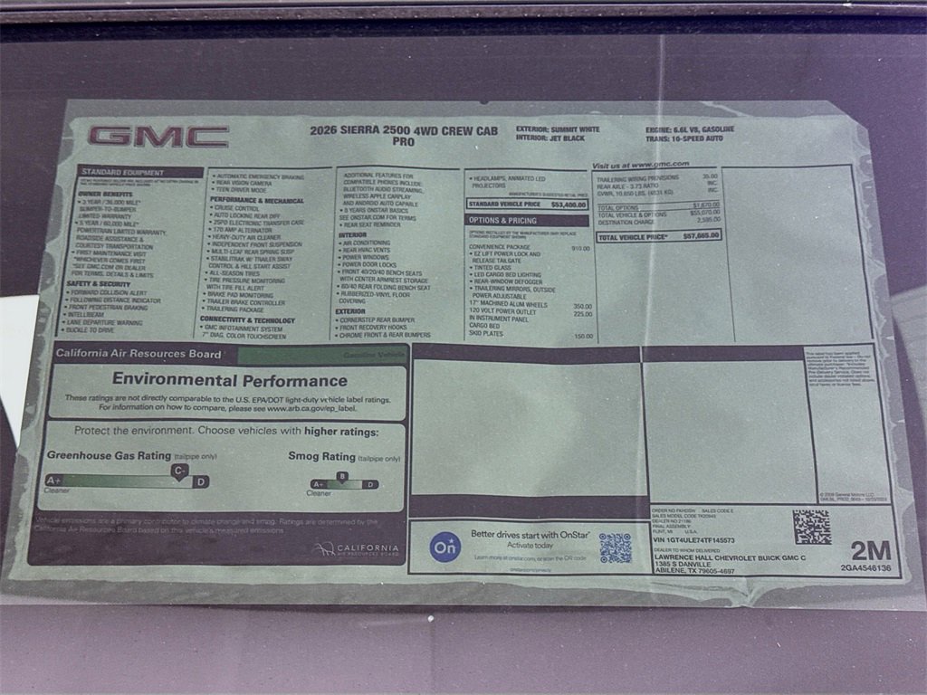 This 2026 GMC Sierra 2500HD Pro New Vehicle Purchase in Summit White comes with the following features: 10-Speed Automatic, 4WD, Black Cloth, 2 Charge/Data USB Ports, 2-Speed Electronic Shift Transfer Case, 3.73 Rear Axle Ratio, 4-Way Manual Driver Seat Adjuster, 4-Way Manual Passenger Seat Adjuster, 4-Wheel Disc Brakes, 6 Speakers, 6-Speaker Audio System Feature, ABS brakes, Air Conditioning, AM/FM radio, Apple CarPlay/Android Auto, Auto High-beam Headlights, Automatic Emergency Braking, Brake assist, Buckle to Drive, Bumpers: chrome, Compass, Delay-off headlights, Driver door bin, Dual front impact airbags, Dual front side impact airbags, Electric Rear-Window Defogger, Electronic Stability Control, Emergency communication system: OnStar, Following Distance Indicator, Forward Collision Alert, Front 40/20/40 Split-Bench Seats, Front anti-roll bar, Front Center Armrest w/Storage, Front Pedestrian Braking, Front reading lights, Front wheel independent suspension, Fully automatic headlights, Heavy-Duty 80 Amp Battery, Illuminated entry, Lane Departure Warning System, Low tire pressure warning, Occupant sensing airbag, OnStar Services Capable, Outside temperature display, Overhead airbag, Overhead console, Panic alarm, Passenger door bin, Passenger vanity mirror, Pickup Box, Power steering, Power windows, Premium audio system: GMC Infotainment System, Push Button Start, Rear reading lights, Rear step bumper, Remote Keyless Entry, Remote keyless entry, Solar Absorbing Tinted Glass, Speed control, Split folding rear seat, Suspension Package, Tachometer, Tilt steering wheel, Traction control, Trip computer, Variably intermittent wipers, Vinyl Seat Trim, Voltmeter, Wheels: 17 Silver Painted Steel, Wireless Phone Projection, 10-Speed Automatic, 4WD, Black Cloth.