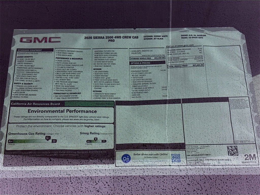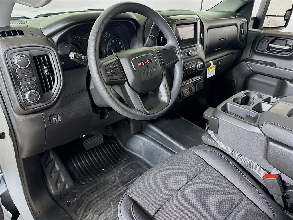 This 2026 GMC Sierra 2500HD Pro New Vehicle Purchase in Summit White comes with the following features: 10-Speed Automatic, 4WD, Jet Black Vinyl, 120-Volt Bed Mounted Power Outlet, 120-Volt Instrument Panel Power Outlet, 17 Machined Aluminum Wheels, 2 Charge-Only Rear USB Ports, 2 Charge/Data USB Ports, 2-Speed Electronic Shift Transfer Case, 3.73 Rear Axle Ratio, 4-Way Manual Driver Seat Adjuster, 4-Way Manual Passenger Seat Adjuster, 4-Wheel Disc Brakes, 5th Wheel and Gooseneck Trailer Wiring Provisions, 6 Speakers, 6-Speaker Audio System Feature, ABS brakes, Air Conditioning, AM/FM radio, Apple CarPlay/Android Auto, Auto High-beam Headlights, Automatic Emergency Braking, Brake assist, Buckle to Drive, Bumpers: chrome, Chrome Grille with Flat Black Grille Insert Bars, Compass, Convenience Package, Deep-Tinted Glass, Delay-off headlights, Driver door bin, Dual front impact airbags, Dual front side impact airbags, Electric Rear-Window Defogger, Electronic Stability Control, Emergency communication system: OnStar, EZ Lift Power Lock and Release Tailgate, Following Distance Indicator, Forward Collision Alert, Front 40/20/40 Split-Bench Seats, Front anti-roll bar, Front Center Armrest w/Storage, Front License Plate Kit, Front Pedestrian Braking, Front reading lights, Front wheel independent suspension, Fully automatic headlights, Heavy-Duty 80 Amp Battery, Illuminated entry, IntelliBeam Automatic High Beam on/Off, Lane Departure Warning System, LED Cargo Area Lighting, Low tire pressure warning, Occupant sensing airbag, OnStar Services Capable, Outside Power-Adjustable Black Mirrors, Outside temperature display, Overhead airbag, Overhead console, Panic alarm, Passenger door bin, Passenger vanity mirror, Pickup Box, Power steering, Power windows, Preferred Equipment Group 1SA, Premium audio system: GMC Infotainment System, Push Button Start, Radio: AM/FM with GMC Infotainment System, Rear reading lights, Rear step bumper, Remote Keyless Entry, Remote keyless entry, Solar Absorbing Tinted Glass, Speed control, Split folding rear seat, Suspension Package, Tachometer, Tilt steering wheel, Traction control, Trip computer, Variably intermittent wipers, Vinyl Seat Trim, Voltmeter, Wheels: 17 Silver Painted Steel, Wireless Phone Projection, 10-Speed Automatic, 4WD, Jet Black Vinyl.