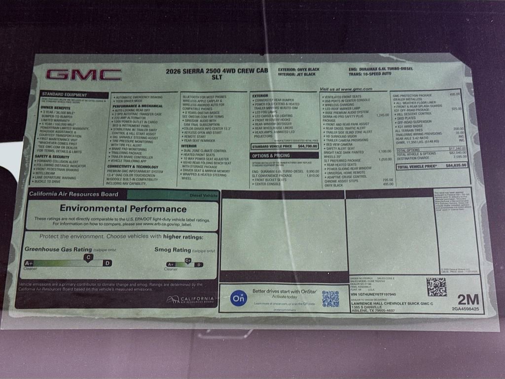 This 2026 GMC Sierra 2500HD SLT New Vehicle Purchase in Onyx Black comes with the following features: 10-Speed Automatic, 4WD, Black Leather, 10-Way Power Driver Seat Adjuster with Lumbar, 10-Way Power Passenger Seat Adjuster with Lumbar, 120-Volt Bed Mounted Power Outlet, 120-Volt Instrument Panel Power Outlet, 18 Machined Aluminum Wheels, 2 Charge-Only Rear USB Ports, 2 Charge/Data USB Ports, 2 Charge/Data USB Ports Inside Center Console, 2-Speed Active Transfer Case, 220-Amp Alternator, 4-Wheel Disc Brakes, 5th Wheel and Gooseneck Trailer Wiring Provisions, 6 Speakers, 6-Speaker Audio System Feature, ABS brakes, Adaptive Cruise Control, Air Conditioning, All-Weather Floor Liners, Alloy wheels, AM/FM radio: SiriusXM with 360L, Apple CarPlay/Android Auto, Auto High-beam Headlights, Auto-dimming door mirrors, Auto-dimming Rear-View mirror, Automatic Emergency Braking, Automatic temperature control, Bed View Camera with Two Trailer Camera Provisions, Black Front and Rear Molded Splash Guards, Bose Premium 7-Speaker Sound System, Brake assist, Buckle to Drive, Bumpers: chrome, Chrome Surround Grille with Chrome Insert Bars, Compass, Deep-Tinted Glass, Delay-off headlights, Driver door bin, Driver Memory, Driver vanity mirror, Dual front impact airbags, Dual front side impact airbags, Electric Rear-Window Defogger, Electronic Stability Control, Emergency communication system: OnStar, Engine Block Heater, Exhaust Brake, Floor-Mounted Center Console, Following Distance Indicator, Forward Collision Alert, Front 40/20/40 Split-Bench Seats, Front anti-roll bar, Front Bucket Seats, Front Center Armrest w/Storage, Front dual zone A/C, Front fog lights, Front License Plate Kit, Front Pedestrian Braking, Front Rain-Sensing Wipers, Front reading lights, Front wheel independent suspension, Fully automatic headlights, GMC Protection Package, HD Surround Vision, Heated 2nd Row Outboard Seats, Heated door mirrors, Heated Driver and Front Outboard Passenger Seats, Heated front seats, Heated steering wheel, Heavy-Duty 80 Amp Battery, Hill Descent Control, Hitch Guidance with Hitch View, Illuminated entry, in-Vehicle Trailering System App, IntelliBeam Automatic High Beam on/Off, Keyless Open and Start, Lane Departure Warning System, LED Cargo Area Lighting, LED Smoked Amber Roof Marker Lamps, Low tire pressure warning, Manual Tilt-Wheel/Telescoping Steering Column, Memory seat, Occupant sensing airbag, Off-Road Suspension, OnStar Services Capable, Outside temperature display, Overhead airbag, Overhead console, Panic alarm, Passenger door bin, Passenger vanity mirror, Perforated Leather-Appointed Front Outboard Seat Trim, Pickup Box, Power door mirrors, Power driver seat, Power Front Passenger Windows with Express Up/Down, Power passenger seat, Power Sliding Rear Window with Defogger, Power steering, Power windows, Preferred Equipment Group 4SA, Premium audio system: Premium GMC Infotainment System, Push Button Start, Radio: AM/FM Stereo with Premium GMC Infotainment System, Rain sensing wipers, Rear Cross Traffic Alert, Rear reading lights, Rear seat center armrest, Rear step bumper, Rear Wheelhouse Liners, Rear window defroster, Remote keyless entry, Remote Vehicle Starter System, Safety Alert Seat, Security system, Sierra HD Pro Safety Plus Package, SiriusXM with 360L Trial Subscription, SLT Convenience Package, SLT Preferred Package, Speed control, Speed-sensing steering, Split folding rear seat, Steering Wheel Audio Controls, Steering wheel mounted audio controls, Suspension Package, Tachometer, Telescoping steering wheel, Tilt steering wheel, Traction control, Trailer Cam Provisions and Trailer Viewing Software, Trailer Side Blind Zone Alert, Trip computer, Turn signal indicator mi Tax, title and license not included. Vehicle may have dealer accessories added. Pricing may not be compatible with cash, outside finance, or special APR offers. Contact dealer for additional details: $1000 - Buic