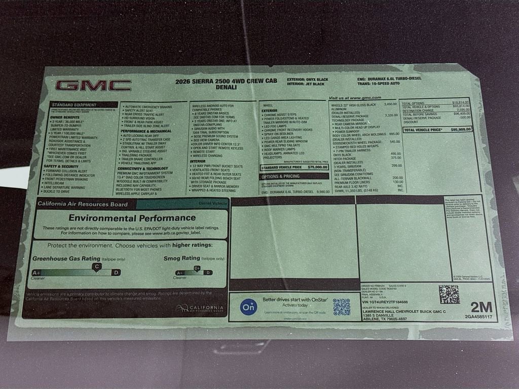 This 2026 GMC Sierra 2500HD Denali New Vehicle Purchase in Onyx Black comes with the following features: 10-Speed Automatic, 4WD, Black Leather, 12-Way Power Driver Seat Adjuster with Lumbar, 12-Way Power Passenger Seat Adjuster with Lumbar, 120-Volt Bed Mounted Power Outlet, 120-Volt Instrument Panel Power Outlet, 2 Charge-Only Rear USB Ports, 2 Charge/Data USB Ports Inside Center Console, 2 USB Ports, 2-Speed Active Transfer Case, 22 High Gloss Black Aluminum Wheels, 220-Amp Alternator, 3 Years SiriusXM, 4-Wheel Disc Brakes, 7 Speakers, ABS brakes, Air Conditioning, Alloy wheels, AM/FM radio: SiriusXM with 360L, Apple CarPlay/Android Auto, Auto High-beam Headlights, Auto-dimming door mirrors, Auto-dimming Rear-View mirror, Automatic Emergency Braking, Automatic temperature control, Bed View Camera with Two Trailer Camera Provisions, Body Color Wheel Arch Moldings, Bose Premium 7-Speaker Sound System, Brake assist, Buckle to Drive, Bumpers: body-color, Compass, Deep-Tinted Glass, Delay-off headlights, Denali Reserve Package, Driver door bin, Driver Memory, Driver vanity mirror, Dual front impact airbags, Dual front side impact airbags, Electric Rear-Window Defogger, Electronic Stability Control, Emergency communication system: OnStar, Engine Block Heater, Exhaust Brake, Floor-Mounted Center Console, Following Distance Indicator, Forge Perforated Leather-Appointed Front Seat Trim, Forward Collision Alert, Front anti-roll bar, Front Bucket Seats, Front Center Armrest, Front dual zone A/C, Front fog lights, Front License Plate Kit, Front Pedestrian Braking, Front Premium Floor Liners with Removable Carpet Insert, Front Rain-Sensing Wipers, Front reading lights, Front wheel independent suspension, Fully automatic headlights, Garage door transmitter, Genuine wood dashboard insert, Genuine wood door panel insert, Gooseneck/5th Wheel Prep Package, HD Surround Vision, Heated 2nd Row Outboard Seats, Heated door mirrors, Heated Driver and Front Outboard Passenger Seats, Heated front seats, Heated rear seats, Heated steering wheel, Heavy-Duty 80 Amp Battery, Hill Descent Control, Hitch Guidance with Hitch View, Hitch Package, Illuminated entry, in-Vehicle Trailering System App, Inside Rearview Auo-Dimming Rear Camera Mirror, IntelliBeam Automatic High Beam on/Off, Keyless Open and Start, Lane Departure Warning System, LED Cargo Area Lighting, LED Smoked Amber Roof Marker Lamps, Low tire pressure warning, Manual Tilt-Wheel/Telescoping Steering Column, Memory seat, Multicolor 15 Diagonal Head-Up Display, Occupant sensing airbag, Off-Road Suspension, OnStar Services Capable, Outside temperature display, Overhead airbag, Overhead console, Panic alarm, Passenger door bin, Passenger vanity mirror, Pickup Box, Polished Exhaust Tip, Power door mirrors, Power driver seat, Power Front Passenger Windows with Express Up/Down, Power passenger seat, Power Sliding Rear Window with Defogger, Power steering, Power Sunroof, Power windows, Preferred Equipment Group 5SA, Premium audio system: Premium GMC Infotainment System, Push Button Start, Radio: AM/FM Stereo with Premium GMC Infotainment System, Rain sensing wipers, Rear Cross Traffic Alert, Rear Premium Floor Liners with Removable Carpet Insert, Rear reading lights, Rear seat center armrest, Rear step bumper, Rear Wheelhouse Liners, Rear window defroster, Remote keyless entry, Remote Vehicle Starter System, Safety Alert Seat, Security system, Signature Chrome Denali Grille, SiriusXM with 360L Trial Subscription, Speed control, Speed-sensing steering, Split folding rear seat, Spray-on Pickup Bedliner with GMC Logo, Steering Wheel Audio Controls, Steering wheel mounted audio controls, Tachometer, Technology Package, Telescoping steering whee Tax, title and license not included. Vehicle may have dealer accessories added. Pricing may not be compatible with cash, outside finance, or special APR offers. Contact dealer for additional details: $1000 - Buick