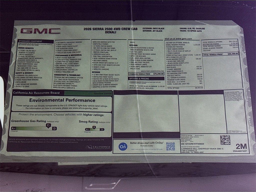 This 2026 GMC Sierra 2500HD Denali New Vehicle Purchase in Onyx Black comes with the following features: 10-Speed Automatic, 4WD, Jet Black Leather, 12-Way Power Driver Seat Adjuster with Lumbar, 12-Way Power Passenger Seat Adjuster with Lumbar, 120-Volt Bed Mounted Power Outlet, 120-Volt Instrument Panel Power Outlet, 2 Charge-Only Rear USB Ports, 2 Charge/Data USB Ports Inside Center Console, 2 USB Ports, 2-Speed Active Transfer Case, 22 Gloss Black Aluminum Wheels, 3 Years SiriusXM, 3.73 Rear Axle Ratio, 4-Wheel Disc Brakes, 7 Speakers, ABS brakes, Air Conditioning, Alloy wheels, AM/FM radio: SiriusXM with 360L, Apple CarPlay/Android Auto, Auto High-beam Headlights, Auto-dimming door mirrors, Auto-dimming Rear-View mirror, Automatic Emergency Braking, Automatic temperature control, Bed View Camera with Two Trailer Camera Provisions, Black Badging Package, Black GMC Emblems, Black Sierra Nameplates, Bose Premium 7-Speaker Sound System, Brake assist, Buckle to Drive, Bumpers: body-color, Compass, Deep-Tinted Glass, Delay-off headlights, Denali Reserve Package, Driver door bin, Driver Memory, Driver vanity mirror, Dual front impact airbags, Dual front side impact airbags, Electric Rear-Window Defogger, Electronic Stability Control, Emergency communication system: OnStar, Floor-Mounted Center Console, Following Distance Indicator, Forge Perforated Leather-Appointed Front Seat Trim, Forward Collision Alert, Front anti-roll bar, Front Bucket Seats, Front Center Armrest, Front dual zone A/C, Front fog lights, Front License Plate Kit, Front Pedestrian Braking, Front Premium Floor Liners with Removable Carpet Insert, Front Rain-Sensing Wipers, Front reading lights, Front wheel independent suspension, Fully automatic headlights, Garage door transmitter, Genuine wood dashboard insert, Genuine wood door panel insert, HD Surround Vision, Heated 2nd Row Outboard Seats, Heated door mirrors, Heated Driver and Front Outboard Passenger Seats, Heated front seats, Heated rear seats, Heated steering wheel, Heavy-Duty 80 Amp Battery, High Idle Switch, Hill Descent Control, Hitch Guidance with Hitch View, Illuminated entry, in-Vehicle Trailering System App, Inside Rearview Auo-Dimming Rear Camera Mirror, IntelliBeam Automatic High Beam on/Off, Keyless Open and Start, Lane Departure Warning System, LED Cargo Area Lighting, LED Smoked Amber Roof Marker Lamps, Low tire pressure warning, Manual Tilt-Wheel/Telescoping Steering Column, Memory seat, Multicolor 15 Diagonal Head-Up Display, Occupant sensing airbag, Off-Road Suspension, OnStar Services Capable, Outside temperature display, Overhead airbag, Overhead console, Panic alarm, Passenger door bin, Passenger vanity mirror, Pickup Box, Polished Exhaust Tip, Power door mirrors, Power driver seat, Power Front Passenger Windows with Express Up/Down, Power passenger seat, Power Sliding Rear Window with Defogger, Power steering, Power Sunroof, Power windows, Power-Retractable Assist Steps, Preferred Equipment Group 5SA, Premium audio system: Premium GMC Infotainment System, Push Button Start, Radio: AM/FM Stereo with Premium GMC Infotainment System, Rain sensing wipers, Rear Cross Traffic Alert, Rear Premium Floor Liners with Removable Carpet Insert, Rear reading lights, Rear seat center armrest, Rear step bumper, Rear Wheelhouse Liners, Rear window defroster, Remote keyless entry, Remote Vehicle Starter System, Safety Alert Seat, Security system, Signature Chrome Denali Grille, SiriusXM with 360L Trial Subscription, Speed control, Speed-sensing steering, Split folding rear seat, Spray-on Pickup Bedliner with GMC Logo, Steering Wheel Audio Controls, Steering wheel mounted audio controls, Tachometer, Technology Package, Telescoping steering whee Tax, title and license not included. Vehicle may have dealer accessories added. Pricing may not be compatible with cash, outside finance, or special APR offers. Contact dealer for additional details: $500 - Buick