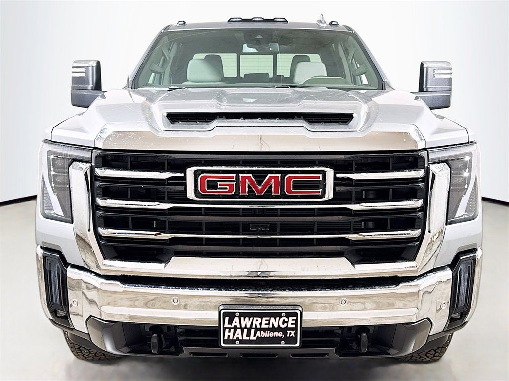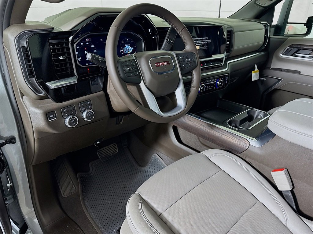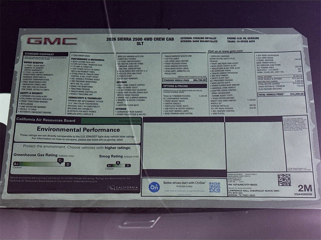 This 2026 GMC Sierra 2500HD SLT Dealer Trade in Sterling Metallic comes with the following features: 10-Speed Automatic, 4WD, Dark Walnut/Slate Leather, 10-Way Power Driver Seat Adjuster with Lumbar, 10-Way Power Passenger Seat Adjuster with Lumbar, 120-Volt Bed Mounted Power Outlet, 120-Volt Instrument Panel Power Outlet, 18 Machined Aluminum Wheels, 2 Charge-Only Rear USB Ports, 2 Charge/Data USB Ports, 2 Charge/Data USB Ports Inside Center Console, 2-Speed Active Transfer Case, 3 Years SiriusXM, 3.73 Rear Axle Ratio, 4-Wheel Disc Brakes, 6 Speakers, 6-Speaker Audio System Feature, ABS brakes, Adaptive Cruise Control, Air Conditioning, Alloy wheels, AM/FM radio: SiriusXM with 360L, Apple CarPlay/Android Auto, Auto High-beam Headlights, Auto-dimming door mirrors, Auto-dimming Rear-View mirror, Automatic Emergency Braking, Automatic temperature control, Bed View Camera with Two Trailer Camera Provisions, Bose Premium 7-Speaker Sound System, Brake assist, Buckle to Drive, Bumpers: chrome, Chrome Surround Grille with Chrome Insert Bars, Compass, Deep-Tinted Glass, Delay-off headlights, Driver door bin, Driver Memory, Driver vanity mirror, Dual front impact airbags, Dual front side impact airbags, Electric Rear-Window Defogger, Electronic Stability Control, Emergency communication system: OnStar, Floor-Mounted Center Console, Following Distance Indicator, Forward Collision Alert, Front 40/20/40 Split-Bench Seats, Front anti-roll bar, Front Bucket Seats, Front Center Armrest w/Storage, Front dual zone A/C, Front fog lights, Front License Plate Kit, Front Pedestrian Braking, Front Rain-Sensing Wipers, Front reading lights, Front wheel independent suspension, Fully automatic headlights, HD Surround Vision, Heated 2nd Row Outboard Seats, Heated door mirrors, Heated Driver and Front Outboard Passenger Seats, Heated front seats, Heated steering wheel, Heavy-Duty 80 Amp Battery, Hill Descent Control, Hitch Guidance with Hitch View, Illuminated entry, in-Vehicle Trailering System App, IntelliBeam Automatic High Beam on/Off, Keyless Open and Start, Lane Departure Warning System, LED Cargo Area Lighting, LED Smoked Amber Roof Marker Lamps, Low tire pressure warning, Manual Tilt-Wheel/Telescoping Steering Column, Memory seat, Occupant sensing airbag, Off-Road Suspension, OnStar Services Capable, Outside temperature display, Overhead airbag, Overhead console, Panic alarm, Passenger door bin, Passenger vanity mirror, Perforated Leather-Appointed Front Outboard Seat Trim, Pickup Box, Power door mirrors, Power driver seat, Power Front Passenger Windows with Express Up/Down, Power passenger seat, Power Sliding Rear Window with Defogger, Power steering, Power windows, Preferred Equipment Group 4SA, Premium audio system: Premium GMC Infotainment System, Push Button Start, Radio: AM/FM Stereo with Premium GMC Infotainment System, Rain sensing wipers, Rear Cross Traffic Alert, Rear reading lights, Rear seat center armrest, Rear step bumper, Rear Wheelhouse Liners, Rear window defroster, Remote keyless entry, Remote Vehicle Starter System, Safety Alert Seat, Security system, Sierra HD Pro Safety Plus Package, SiriusXM with 360L Trial Subscription, SLT Convenience Package, SLT Preferred Package, Speed control, Speed-sensing steering, Split folding rear seat, Spray-on Pickup Bedliner with GMC Logo, Steering Wheel Audio Controls, Steering wheel mounted audio controls, Suspension Package, Tachometer, Telescoping steering wheel, Texas Edition Badging, Texas SLT Premium Package, Tilt steering wheel, Traction control, Trailer Cam Provisions and Trailer Viewing Software, Trailer Side Blind Zone Alert, Trip computer, Turn signal indicator mirrors, Ultrasonic Front and Rear Park Assist, Unauthorized E Tax, title and license not included. Vehicle may have dealer accessories added. Pricing may not be compatible with cash, outside finance, or special APR offers. Contact dealer for additional details: $500 - Buic