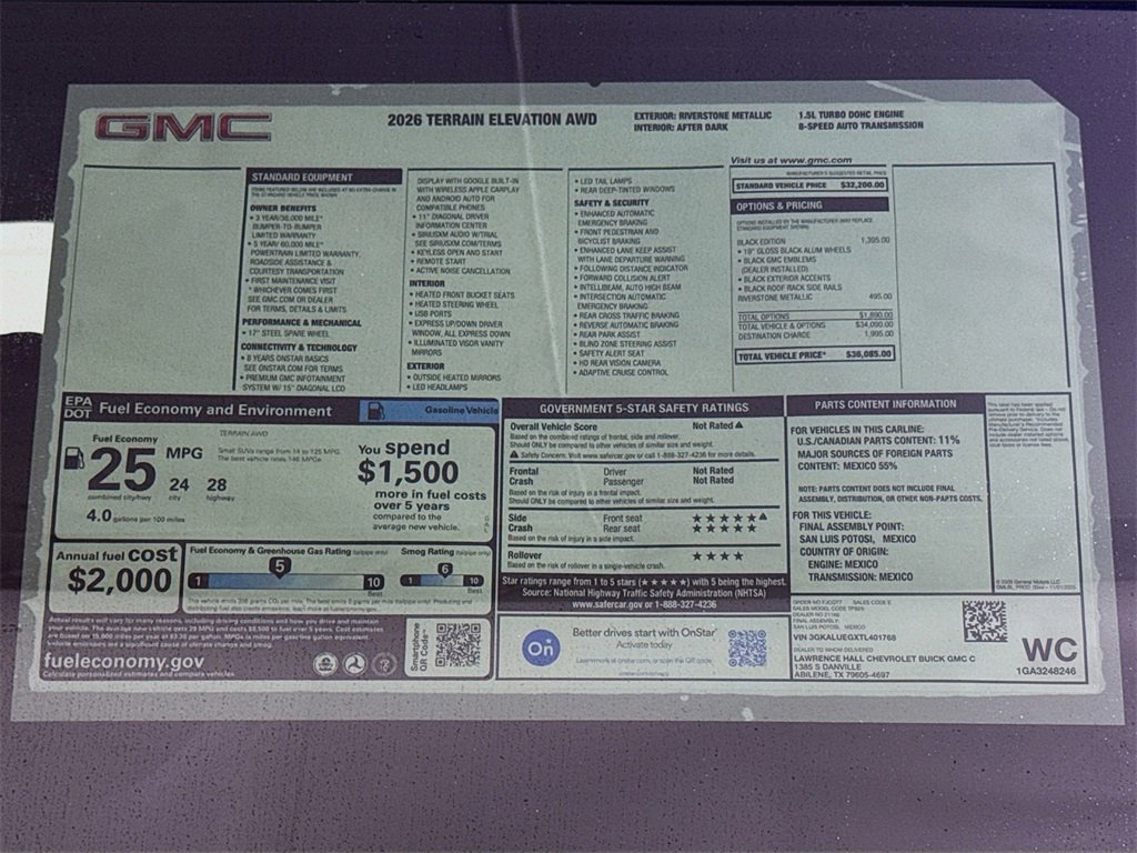 This 2026 GMC Terrain Elevation New Vehicle Purchase in Riverstone Metallic comes with the following features: AWD, 3.47 Final Drive Axle Ratio, 4-Wheel Disc Brakes, 6 Speakers, 6-Speaker Audio System Feature, ABS brakes, Air Conditioning, Alloy wheels, AM/FM radio: SiriusXM, Auto High-beam Headlights, Automatic temperature control, Black Edition, Black Exterior Accents and Black Exterior Badging, Black Mirror Caps, Brake assist, Brushed Aluminum Roof Rails, Bumpers: body-color, Compass, Darkened Grille and C Shaped Surrounding Bezel, Delay-off headlights, Driver 6-Way Manual Seat Adjuster, Driver and Front Passenger Heated Seats, Driver door bin, Driver vanity mirror, Dual front impact airbags, Dual front side impact airbags, Electronic Stability Control, Emergency communication system: OnStar and GMC connected services capable, Four wheel independent suspension, Front and Rear Black GMC Emblems, Front anti-roll bar, Front Bucket Seats, Front Center Armrest, Front Passenger 4-Way Manual Seat Adjuster, Front reading lights, Fully automatic headlights, Heated door mirrors, Heated front seats, Heated steering wheel, Illuminated entry, License Plate Front Mounting Package, Low tire pressure warning, Navigation System, Occupant sensing airbag, Outside temperature display, Overhead airbag, Panic alarm, Passenger door bin, Passenger vanity mirror, Power door mirrors, Power steering, Power windows, Preferred Equipment Group 3SB, Premium Cloth Seat Trim, Radio data system, Radio: Premium GMC Infotainment System, Rear air conditioning, Rear anti-roll bar, Rear seat center armrest, Rear window defroster, Rear window wiper, Remote keyless entry, Security system, SiriusXM with 360L Trial Subscription, Speed control, Speed-sensing steering, Split folding rear seat, Spoiler, Sport steering wheel, Steering wheel mounted audio controls, Tachometer, Telescoping steering wheel, Tilt steering wheel, Traction control, Trip computer, Variably intermittent wipers, Wheels: 17 Grazen Metallic Machined Aluminum, Wheels: 19 Gloss Black Painted Aluminum, Wireless Apple CarPlay/Wireless Android Auto, AWD.