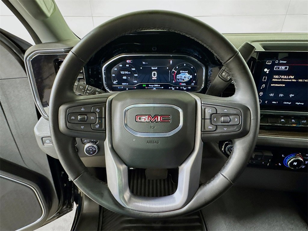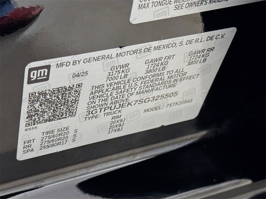 2025 GMC Sierra 1500 Elevation 8-Speed Automatic, 4WD, Black Cloth, 10-Way Power Driver Seat Adjuster w/Lumbar, 120-Volt Bed Mounted Power Outlet, 120-Volt Interior Power Outlet, 2 Charge/Data USB Ports, 2 Type-C Charge-Only Rear USB Ports, 220 Amp Alternator, 3.42 Rear Axle Ratio, 4-Way Manual Passenger Seat Adjuster, 4-Wheel Disc Brakes, 6 Speakers, 6-Speaker Audio System Feature, ABS brakes, Air Conditioning, Alloy wheels, AM/FM radio: SiriusXM with 360L, Apple CarPlay/Android Auto, Auto High-beam Headlights, Auto-Locking Rear Differential, Automatic Emergency Braking, Automatic temperature control, Body Color Header w/Gloss Black Mesh Grille Bars, Brake assist, Buckle to Drive, Bumpers: body-color, Cloth Seat Trim, Color-Keyed Carpeting Floor Covering, Compass, Deep-Tinted Glass, Delay-off headlights, Driver door bin, Driver vanity mirror, Dual front impact airbags, Dual front side impact airbags, Electric Rear-Window Defogger, Electronic Stability Control, Emergency communication system: OnStar, Following Distance Indicator, Forward Collision Alert, Front 40/20/40 Split-Bench Seat, Front anti-roll bar, Front Center Armrest w/Storage, Front dual zone A/C, Front fog lights, Front Frame-Mounted Black Recovery Hooks, Front Pedestrian Braking, Front reading lights, Front Rubberized-Vinyl Floor Mats, Front wheel independent suspension, Fully automatic headlights, Genuine wood dashboard insert, HD Rear Vision Camera, Heated door mirrors, Heated Driver & Front Outboard Passenger Seating, Heated front seats, Heated steering wheel, High Capacity Suspension Package, Hitch Guidance, Illuminated entry, Integrated Trailer Brake Controller, IntelliBeam Automatic High Beam On/Off, Keyless Open & Start, Lane Keep Assist w/Lane Departure Warning, LED Cargo Area Lighting, Low tire pressure warning, Manual Tilt-Wheel & Telescoping Steering Column, Navigation System, Occupant sensing airbag, OnStar Services Capable, Outside temperature display, Overhead airbag, Overhead console, Panic alarm, Passenger door bin, Passenger vanity mirror, Power Door Locks, Power door mirrors, Power driver seat, Power Front Windows w/Driver Express Up/Down, Power Front Windows w/Passenger Express Down, Power Rear Windows w/Express Down, Power steering, Power windows, Preferred Equipment Group 3VL, Push Button Start, Radio data system, Radio: Premium GMC Infotainment Audio System, Rear reading lights, Rear Rubberized-Vinyl Floor Mats, Rear seat center armrest, Rear step bumper, Rear window defroster, Remote keyless entry, Remote Vehicle Starter System, Security system, SiriusXM w/360L Trial Subscription, Speed control, Speed-sensing steering, Split folding rear seat, Steering Wheel Audio Controls, Steering wheel mounted audio controls, Tachometer, Telescoping steering wheel, Theft Deterrent System (Unauthorized Entry), Tilt steering wheel, Traction control, Trailering Package, Trip computer, Variably intermittent wipers, Voltmeter, Wheels: 20 x 9 High Gloss Black Painted Aluminum, Wi-Fi Hotspot Capable, Wireless Apple CarPlay/Wireless Android Auto, 8-Speed Automatic, 4WD, Black Cloth.